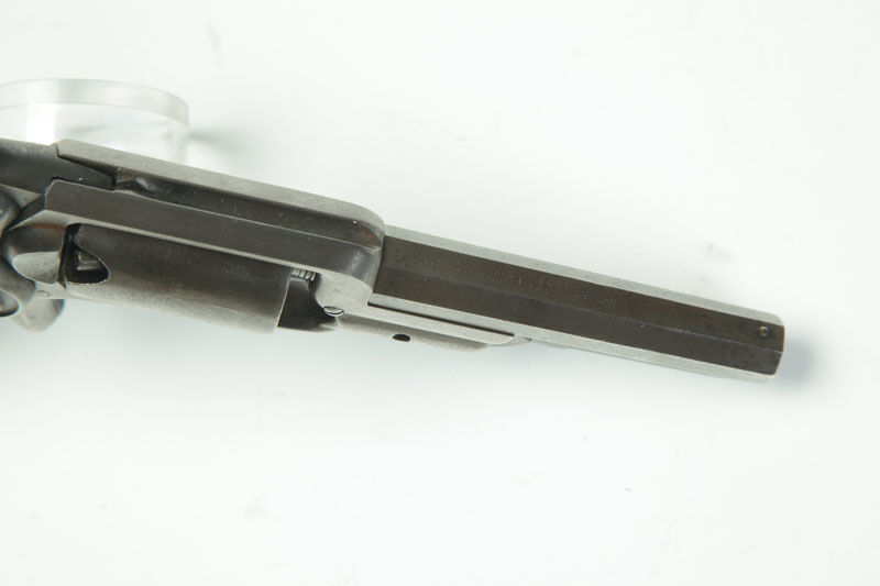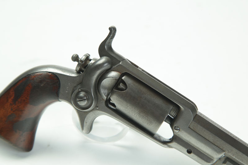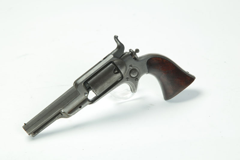 Model 1855 sidehammer, second model, .28 caliber, 3 1/2" octagonal barrel, cylinder with engraved scene, Hartford address with pointing hand, and walnut grips. S/n 8157 (matching).