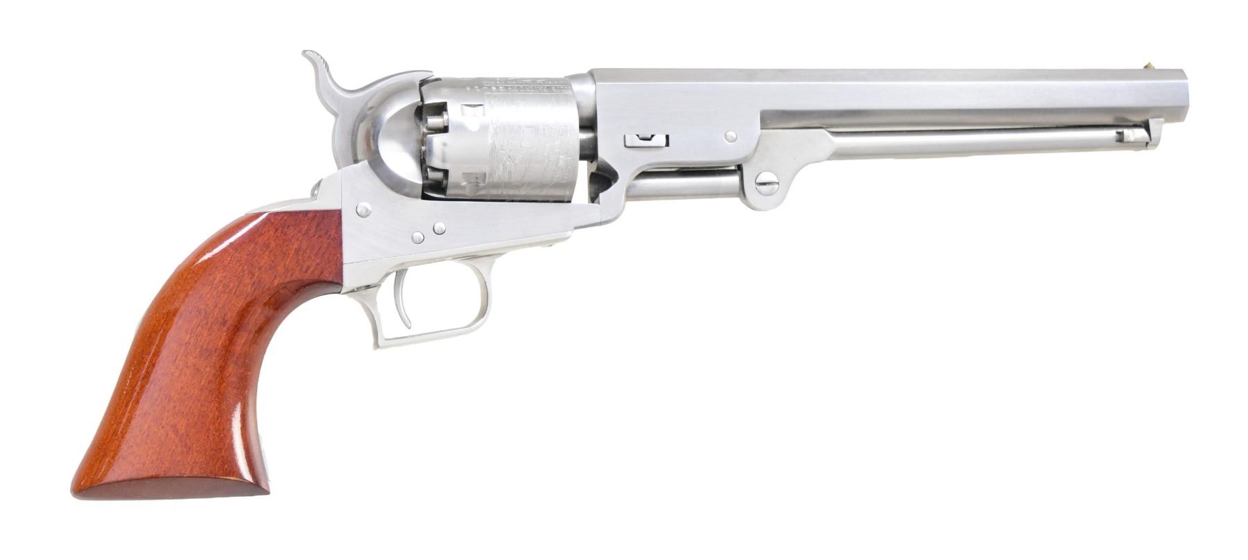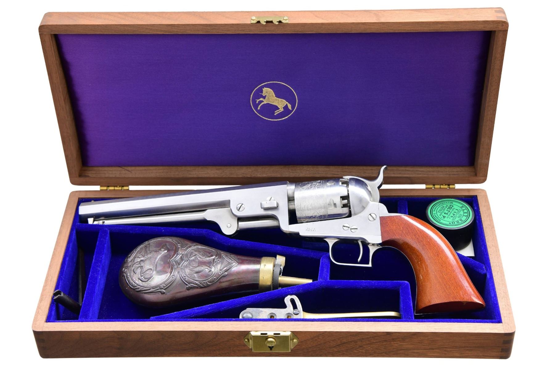 REVOLVER. Cal. 36. S# 29416S. Bbl. 7 1/2" octagon w/ brass comb style front sight. Six shot round cyl. w/ naval scene roll engraving. Stainless steel construction. 2 piece walnut grips. Only 490 mfg. in 1982. UNATTACHED ACCESSORIES: Colt walnut case w/ blue velour fitted interior. Case contains powder flask, 2 cavity bullet mold, nipples wrench & cap tin. Also includes original black box containing instructions, black powder series brochure & hang tag. Box shows some tattering. CONDITION: near excellent showing a few very light marks. Bright near excellent bore. PROVENANCE: From the lifelong Collection of Jim Williams. (01-25481/DS). ANTIQUE. $1,000-1,500.