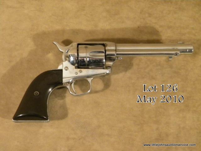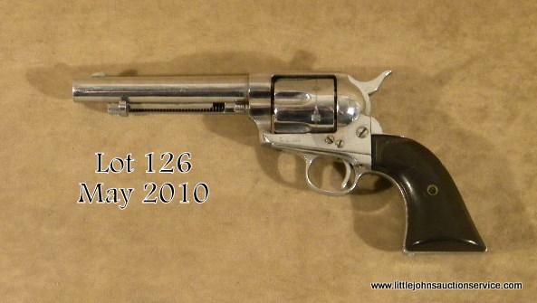 COLT SAA, #29583, .45 cal, 5.5" barrel, chromed finish, hard rubber grips. Early single action dating about 1885, cut down barrel from 7.5" to 5.5", two line 1872 patent date, early cylinder, all matching numbers. Some pitting under the newfinish, grips are poor fitting and well worn. Est. $700-$1,400.