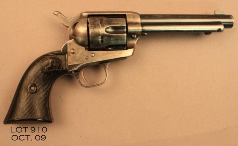 COLT SAA, # 349806, .32 WCF, blued finish, color case hardened frame and hammer, hard rubber grips. 30%-50% original finish remains, mainly in the protected areas. Grips are fair condition showing a crack in the lower half of the left grip pane and minor chips and scratches, and moderate wear to the checkering. Bore is very good. Est. $1,250-$2,500.