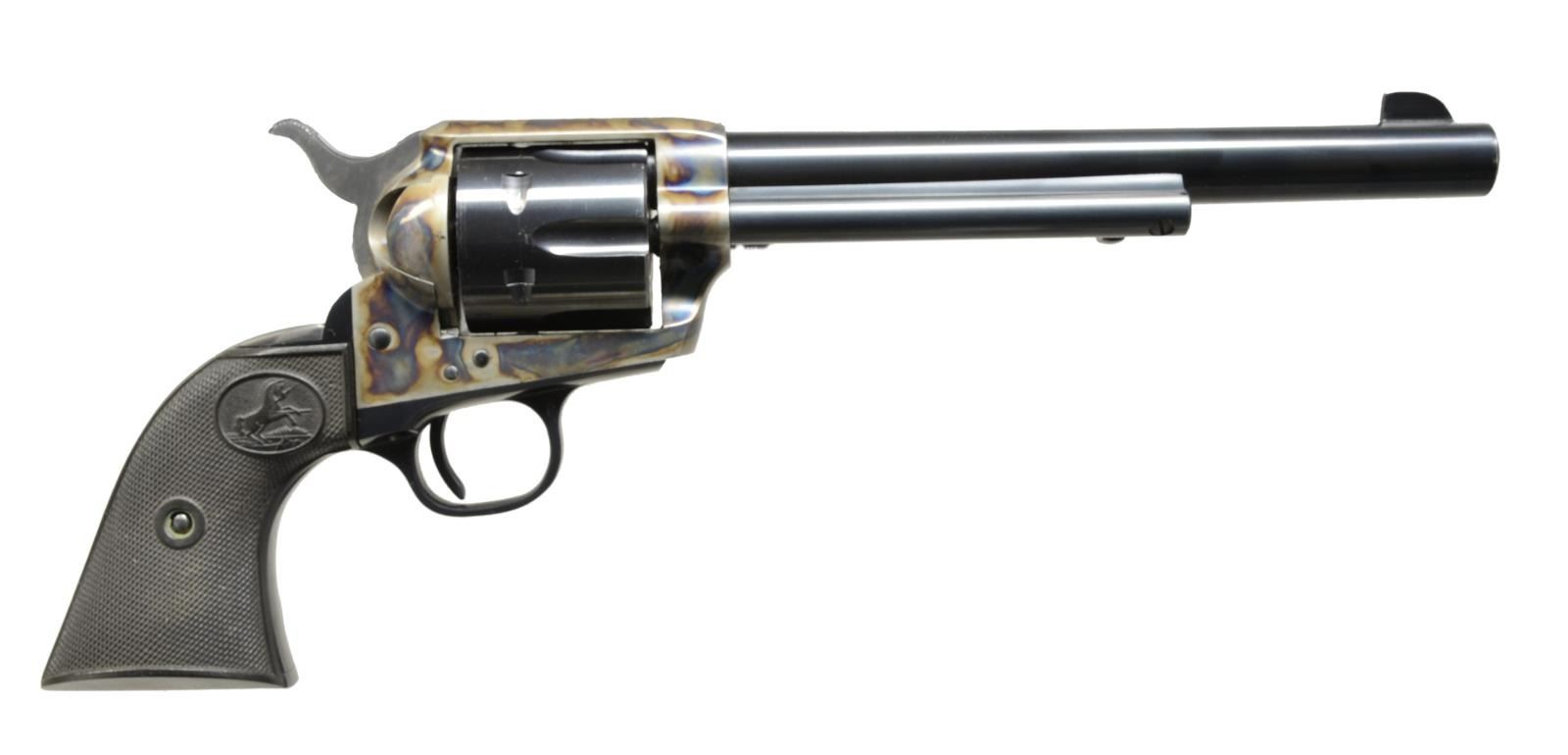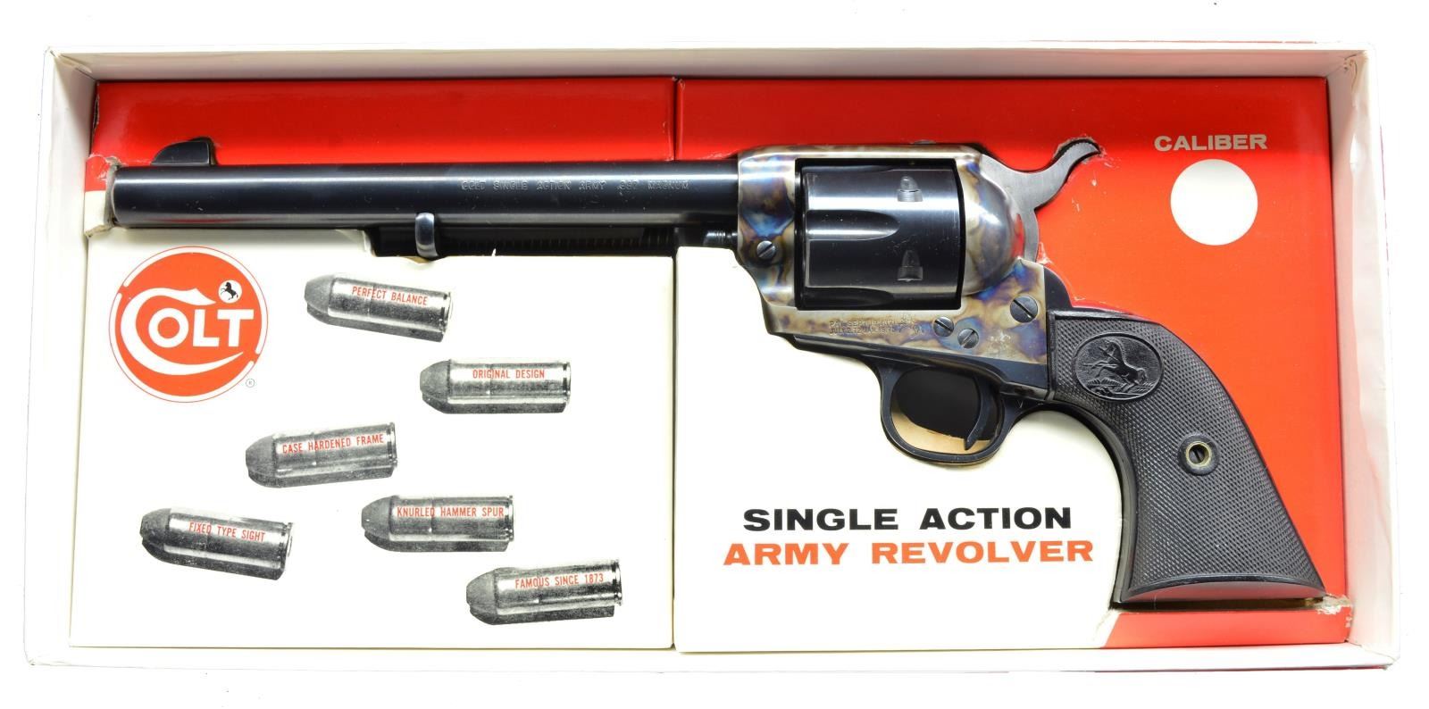 Cal. 357 Mag. S# 50573SA. Bbl. 7 1/2". 6 Shot fluted cyl. Blue finish w/ case colored frame. 2 Piece checkered Rampant Colt grips. 1969 Mfg. UNATTACHED ACCESSORIES: 2 piece Stagecoach box w/ proper label. Box contains instruction pamphlet & warranty cards. CONDITION: over 98% original metal finish showing spots of finish loss w/ cyl. drag line. Very good grips. Crisp mechanics. Near excellent bore. PROVENANCE: Collection of Alan Bradley Shepherd. (20-4041/DS). CURIO. $2,250-3,000.
