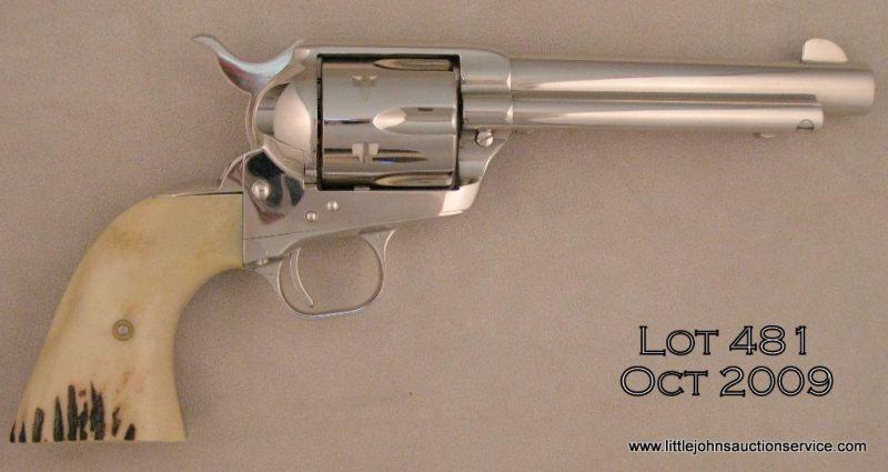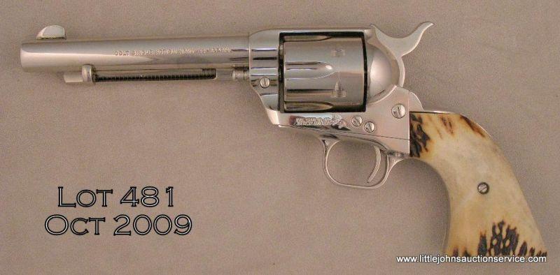 COLT SAA revolver, # SA29583, .44 Spl., 5 1/2" barrel, nickel plated, stag grips. This early 3rd generation remains in near excellent condition with 95%-98% original finish, slight scratches, some powder burns on the front of the cylinderthat may clean. Est. $700-$1400.