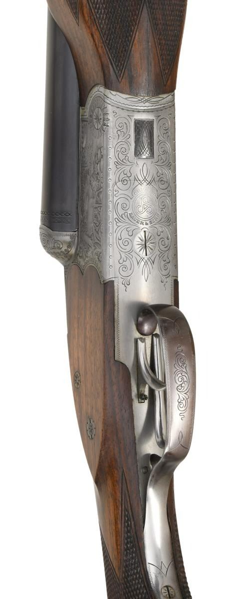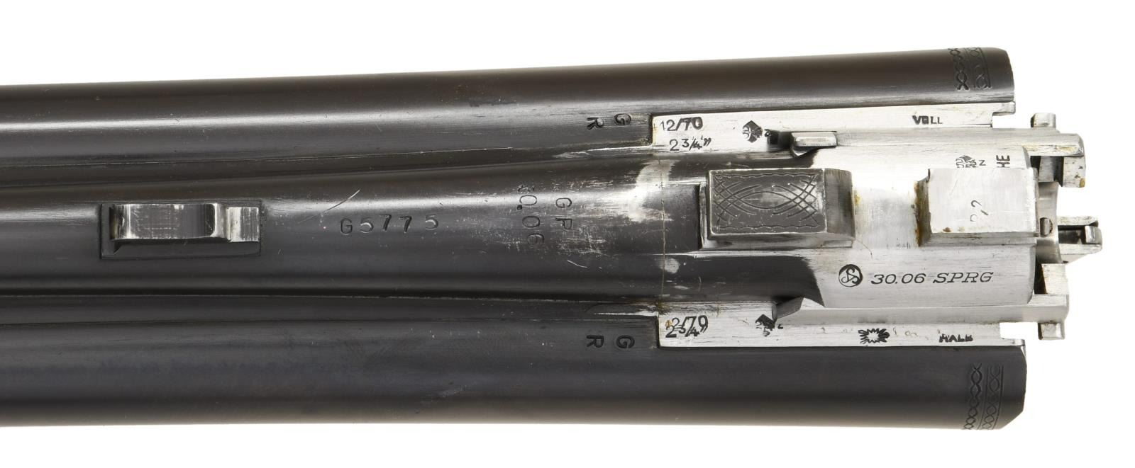 Cal. 12 Ga., 3/4" / 30-06. S# G5775 (HE = 1974). A well mfg. by JP Sauer & Sohn of West Germany for the American market w/ distinctly "American" cartridges. Krupp Spezial 25" bbls. feature sling swivel, raised matte rib, rib extension, Sourdough front sight & pop-up rear sight. Fixed Mod. & Full chokes. Water Table has 1974 Nitro proofs for 2 3/4" chambers. Coin finish Blitz action w/ ornate relief engraving of elk in woodland scene on right side & prancing white tail buck in woodland scene on left side. Scenes are highlighted w/ geometric pattern border engraving. Action features include crossbolt safety, Greener style safety, cocking indicators, dbl. triggers, extractors & top tang selector. Beavertail walnut forearm w/ point pattern checkering & matching Deeley release. Pistol grip walnut stock w/ checkering at wrist, sling swivel on toeline & black composite grip cap. LOP: 13 5/8" to Sauer black ventilated pad. DAC: 1 1/2". DAH: 2". CAST: neutral. WEIGHT: 7.9 lbs. CONDITION: very good to near excellent bbls. blue retaining over 95% finish showing light marks around bbl. channel lines. Near excellent coin finish. Very good to near excellent original wood finish showing light impressions that doesn't pierce finish. Bottom of forearm has 1 1/2" crack extending from iron. Bright shiny bores showing light fouling near muzzle. (23-1108/MD). MODERN. $2,500-3,500