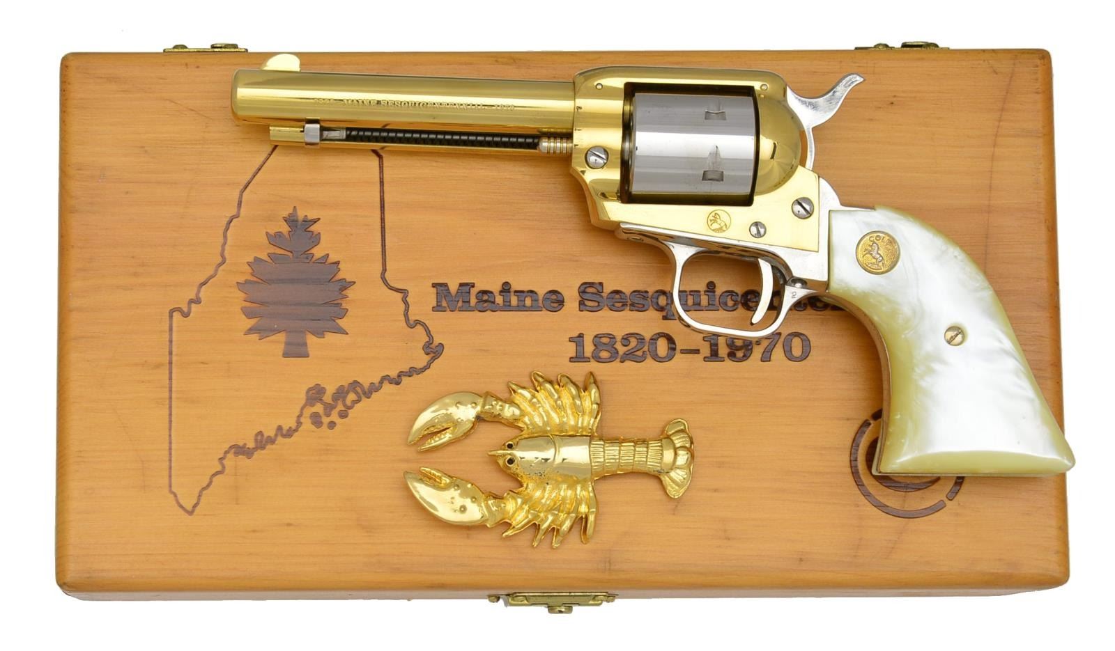 Cal. 22 LR. S# 822MES. Bbl. 4 3/4" w/ blade front sight & frame notched rear. Mfg. 1970 to celebrate Maine's 150th year of statehood. Mixture of gold & nickel plating throughout plus simulated pearl grips w/ gold Colt medallions. Augusta native Calvin Glazier convinced Colt to do the Maine commemorative. 3,000 Units produced in characteristic Maine pine box having iconic gold plated lobster included. Interior of case is blue velvet & satin w/ gold Maine State outline under lid. Exterior of pine box also has Maine logos wood burned onto lid. 1970 Sales price was $125. UNATTACHED ACCESSORIES: pine presentation box w/ lobster plus manual. Outline of prior square price sticker on end of base. CONDITION: all aspects near excellent appearing new & unfired. (20-2501/NW). MODERN (Not CURIO until Jan.1, 2021). $500-700.