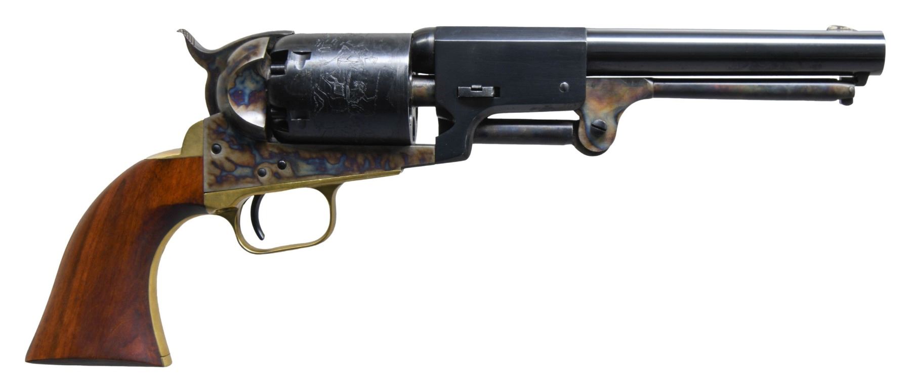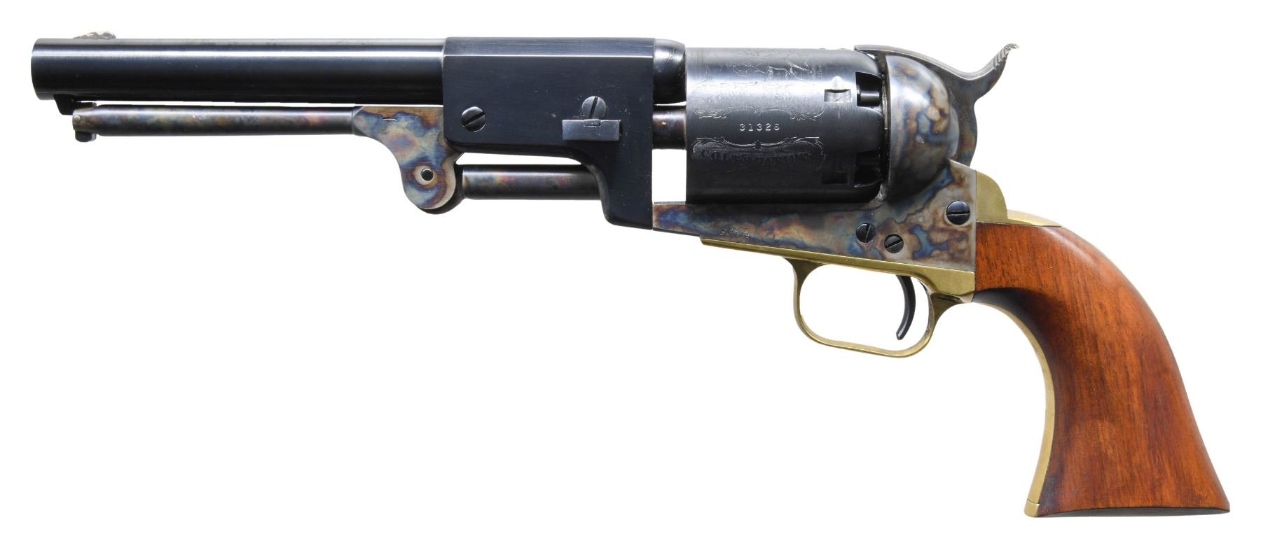SINGLE ACTION PERCUSSION REVOLVER WITH FACTORY BOX. Cal. 44. S# 31326. Bbl. 7 1/2". Second Generation Third Model Dragoon single action percussion revolver mfg. by Colt during the early 1980s. The top of bbl. is marked with Colt's single line New York address. Left side of the frame is marked "COLTS/ PATENT". Cyl. is marked with Colt's roll engraved Texas Ranger scene. Frame, hammer, and loading lever exhibit a case color hardened finish, with the bbl., bbl. wedge, cyl., and bbl. exhibiting a blue finish. Brass trigger guard and backstrap are fitted with a 1-piece smooth wood grip. Silver blade front sight with V-notch rear sight on hammer. All serialized parts are matching. UNATTACHED ACCESSORIES: factory box matching via the full S# in marker on the end label. CONDITION: near new, with metal components retaining virtually all of their original factory finishes overall, save for on the front sight, which appears to exhibit flaking. Mirror bore, retaining well defined rifling throughout. Grip is excellent. Box shows some external wear, but otherwise remains sturdy and serviceable. PROVENANCE: Estate of Russell Dickerman. (01-27138/MLW). ANTIQUE. $500-800.
