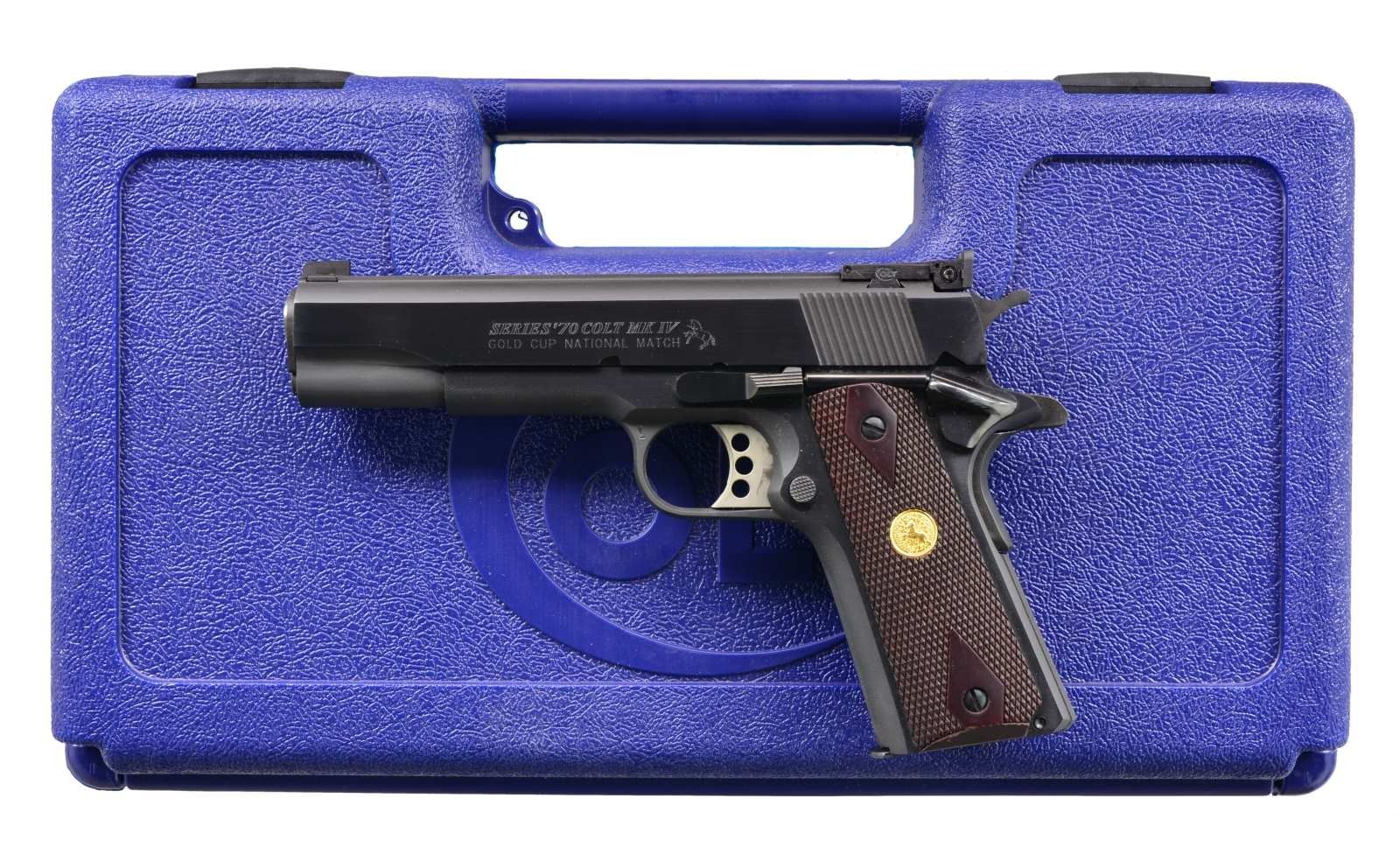 SEMI AUTO PISTOL. Cal. 45 ACP. S# 71N08065. Bbl. 5". Patridge front sight w/ Elliason Rampant Colt marked square notch rear sight. National Match marked bbl. Skeletonized adj. trigger. Frame & slide have polished sides w/ matte blued upper & lower surfaces. 2 Piece checkered rosewood grips w/ gold Rampant Colt medallions. MAGS: 2 detachable 7 rd. UNATTACHED ACCESSORIES: Colt blue molded box w/ matching label. Box contains owner's manual, trigger lock, hang tag & spare recoil spring. CONDITION: as new in box. (20-2603/DS). MODERN. $800-1,200.
