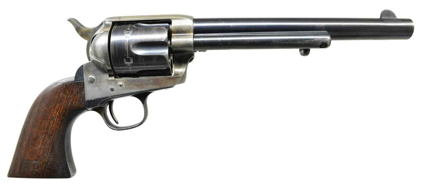 MODEL REVOLVER. Cal. 45 Colt. S# 112022. The iconic Single Action Army introduced in 1873 remains the most popular revolver ever. Delivery of the 7 1/2" Cavalry Model to the U.S. Ordnance Department began in September, 1873. This revolver was part of the largest group of Cavalry revolvers delivered from 1880-1887 & inspected under the supervision of Principal Sub-Inspector David F. Clark. Bbl. 7 1/2" with blade front sight. 6 Shot fluted cylinder. Blackpowder frame. Bullseye ejector head. 1 Piece walnut grips. Blue finished bbl., grip straps & trigger with case colored frame & hammer. Left side of frame is stamped "US" behind 3 line patent date marking. Bottom of frame above S# has David F. Clark's "DFC" initials. Back of cylinder has "S" inspection mark. Trigger guard & backstrap below S#"s have "G" inspection marks. Hammer slot in frame has inspector mark "I". Bottom of barrel is marked with proof mark "P" above "DFC" inspection mark. Bbl. beneath ejector housing has inspectors marks "O", "G" & "J". Bottom of ejector housing has scratched marking "83769". Bbl., frame, grip straps & cyl. have matching numbers. Right grip panel has 1884 manufacture date over "FH" Frank Heath cartouche. Bottom of left grip panel has "DFC" inspection mark. Right grip panel has "DFC" cartouche with 3 stamped markings that resemble a half moon on butt. CONDITION: exceptional all original revolver showing only light carry wear. Barrel and ejector housing retain over 90% blue. Cylinder shows 70% lightly faded blue with drag line. Grip straps retain over 80% lightly faded blue. Frame & hammer exhibit 90% lightly faded case colors. Grips show moderate edge & finish wear, most markings are clear. Action function is crisp. Lightly pitted bore retains sound rifling. (01-21432/DS). ANTIQUE. $25,000-40,000.