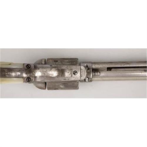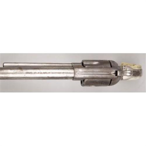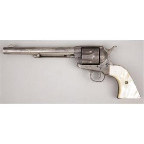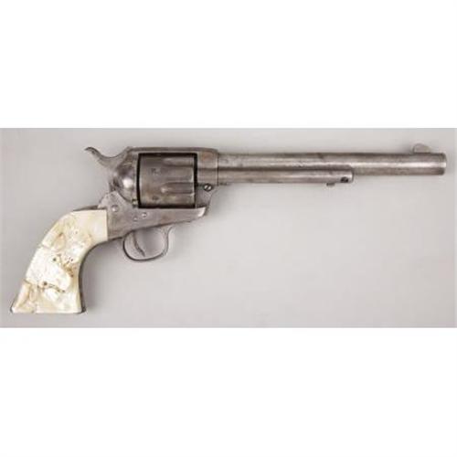 <B>COLT SINGLE ACTION ARMY</B></I> - Serial number 171896, circa 1897. 7 ½” barrel in .32 W.C.F calibre. Nickel finish with mother of pearl carved with steer head grips. All serial numbers match. Markings and features are standard for this model and original. Accompanying this lot is a leather belt with holster rig.<BR><BR><B>Condition:</B></I> About fifteen of what appears to be the original nickel plating remains, mainly on the backstrap and under the barrel. The carved steer head grips are old and attractive on the revolver. A few minor chips are evident on the right grip with hand engraved initials F.M.R. or T.M.R. on the butt of the backstap after the period of use of the revolver. The Belt and holster with this revolver show some age but are not nearly as old as the revolver. They are both supple but the holster is trimmed.<BR><BR><b>Shipping:</b> Bats, Clubs, Sticks, Swords, Rif (<a target="_blank" href="http://www.heritageauctions.com/common/shipping.php">view shipping information</a>)
