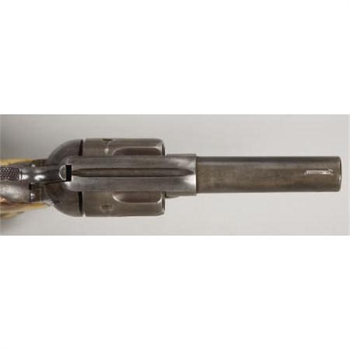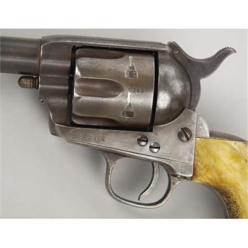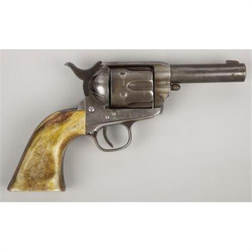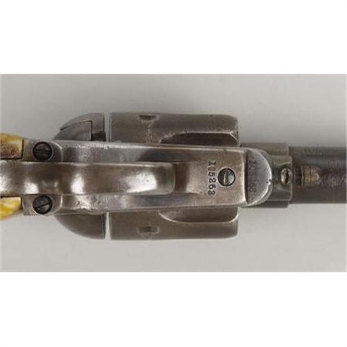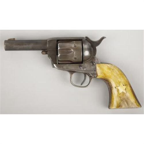 <B>COLT SINGLE ACTION REVOLVER</B></I> - Serial number 105263, circa 1884. 3½" barrel in .45 caliber. Serial numbers match throughout with the exception of the barrel. Stag or bone grips. Mechanically functions. <BR><BR><B>Condition:</B></I> Barrel shortened to current length and front sight added. Frame modified to remove portion that retains the rear of the ejector housing making the revolver appear to be a Sheriff's Model. Entire metal surfaces have been cleaned and artificially aged back a bit. Grips fit well and have a five point star inlayed on the left ride.<BR><BR><b>Shipping:</b> Bats, Clubs, Sticks, Swords, Rif (<a target="_blank" href="http://www.heritageauctions.com/common/shipping.php">view shipping information</a>)