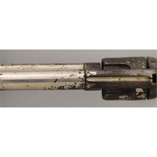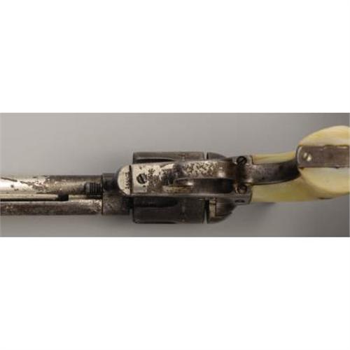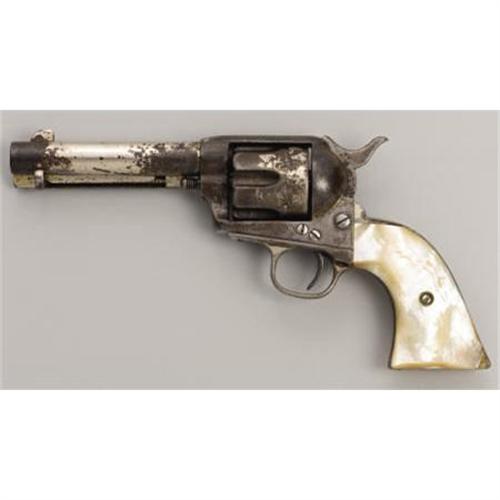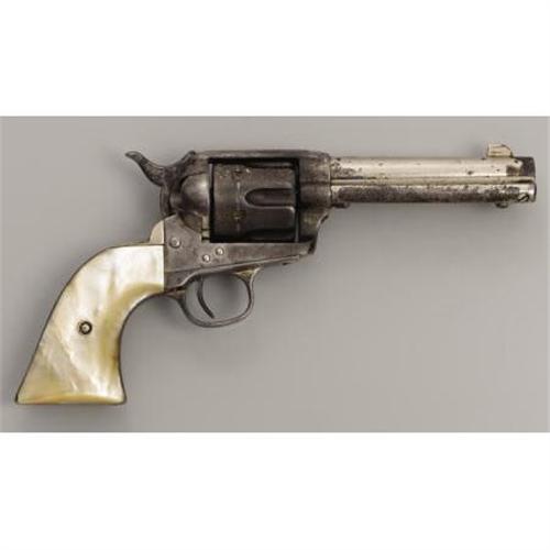 <B>COLT SINGLE ACTION REVOLVER</B></I> - Serial number 144501, circa 1892. 4 ¾” barrel in .45 cailbre. All factory applied stampings and configuration are standard for this model. Fitted with very attractive pair of pearl grips. Functioning action.<BR><BR><B>Condition:</B></I>It appears the twenty percent of the finish remaining on this revolver is silver. The overall wear on the revolver does not allow for an accurate assessment relative to the finish applied by the factory in the absence of a factory letter. A little rounding of the frame metal around the screw holes and at the juncture of the frame where the straps are attached hints at possible refinishing, albeit a long time ago. Majority of metal finish where no plating remains is quite dark for the most part, with relatively minor pitting. Pearl grips fit the straps extremely well and show good age. There is one chip out of the left grip at the rear of the backstrap.<BR><BR><b>Shipping:</b> Bats, Clubs, Sticks, Swords, Rif (<a target="_blank" href="http://www.heritageauctions.com/common/shipping.php">view shipping information</a>)