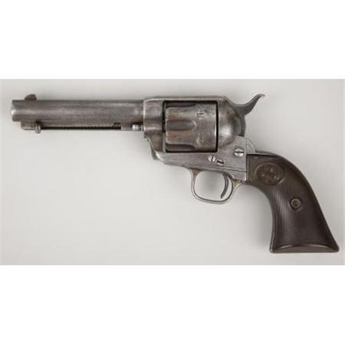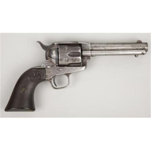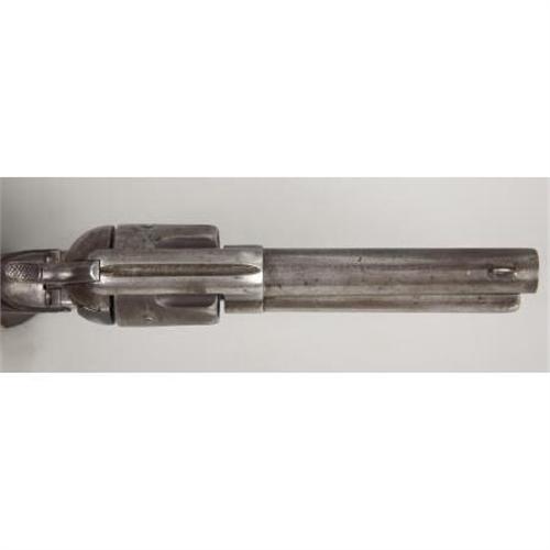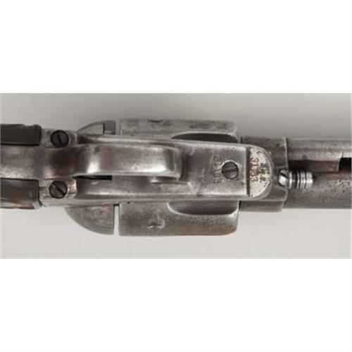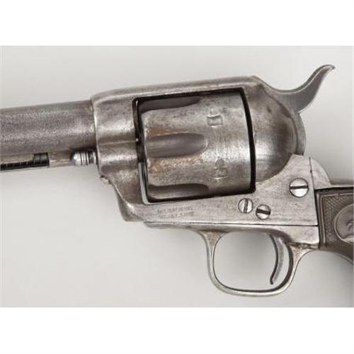 <B>COLT SINGLE ACTION REVOLVER</B></I> - Serial number 31133, circa 1876. 4 7/8" barrel in .45 caliber. All serial numbers match throughout. Rubber grips. Mechanically functional. <BR><BR><B>Condition:</B></I> Original 7½" barrel shortened to current length with front sight added. Hard rubber grips replaced original wood grips. Interestingly, the non-U.S. stamped frame is stamped J.T.C. on the bottom flat about the serial number (government inspector James T. Cleveland). Adding further interest, a deeply struck 'C' partially obliterates the 'T' in J.T.C. Probably the over stamped 'C' is for condemned. Small hole drilled in bottom of backstrap on butt. Entire revolver is a relatively uniform grey color with minor pitting. Base pin and a few screws replaced.<BR><BR><b>Shipping:</b> Bats, Clubs, Sticks, Swords, Rif (<a target="_blank" href="http://www.heritageauctions.com/common/shipping.php">view shipping information</a>)