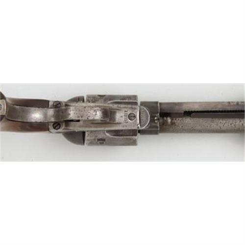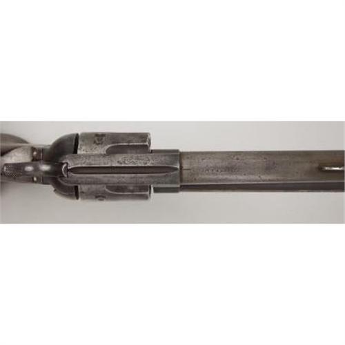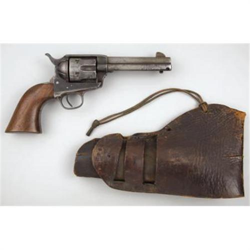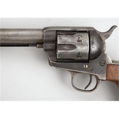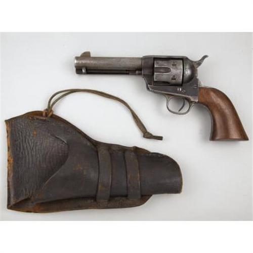 <B>COLT SINGLE ACTION REVOLVER</B></I> - Circa 1880-90s. Mixed serial numbers: frame serial number 119949, D.F.C. inspected with U.S. on frame, trigger guard serial number 133913 with a "K", backstrap not legible, but inspected with a "G", no barrel or cylinder serial numbers present. One piece walnut wood grip. An original Colt 4¾" barrel with two line address in .45 Colt has been added to this revolver. Hammer checkering pattern is of the last factory first generation style. Functioning action. Accompanied by a black leather two loop holster. <BR><BR><B>Condition:</B></I>The frame is quite dark. The remainder of the metal components are a lighter grey. Old wood grips are about perfect and fit the straps nicely. Holster is plain black leather, soft and pliable.<BR><BR><b>Shipping:</b> Miscellaneous Collectibles, Larg (<a target="_blank" href="http://www.heritageauctions.com/common/shipping.php">view shipping information</a>)