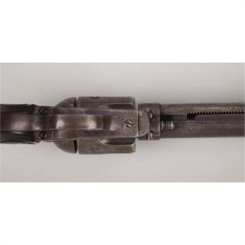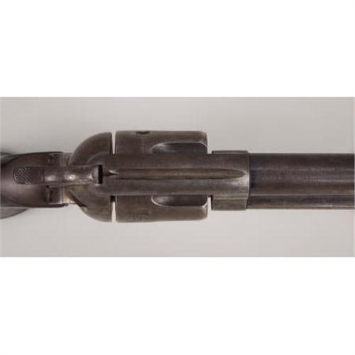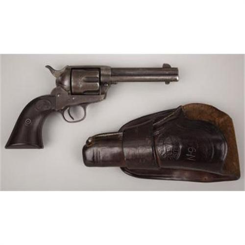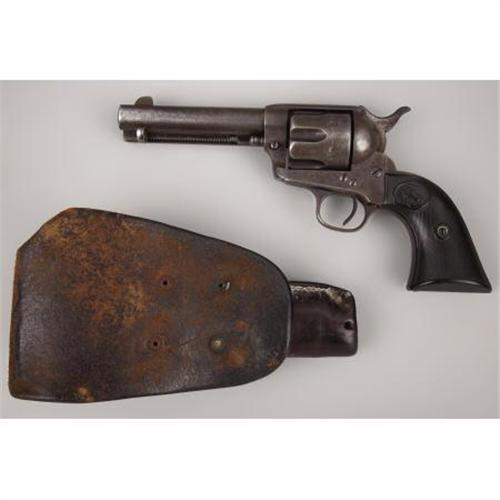 <B>COLT SINGLE ACTION REVOLVER</B></I> - Serial number 165640, circa 1896. 4 ¾” barrel in .44-40 calibre. This revolver was made during the first year the transverse cylinder pin became standard. Barrel marked on top with two line address and 'COLT FRONTIER SIX SHOOTER' on left side. All serial numbers match and factory stampings are clear and legible. Hard rubber checkered Colt logo grips. Mechanically functional. Accompanying this lot is a leather holster, single loop marked, 'JOS. SULLIVAN - MAKER - FT. BENTON. M.T.'<BR><BR>Condition: Traces of original blue. Balance of metal surfaces evidence normal dings and nicks with exception of some minor pitting on left side of barrel and radii of ejector housing. Holster is very sound, trimmed only in the area by the triggerguard.<BR><BR><b>Shipping:</b> Bats, Clubs, Sticks, Swords, Rif (<a target="_blank" href="http://www.heritageauctions.com/common/shipping.php">view shipping information</a>)