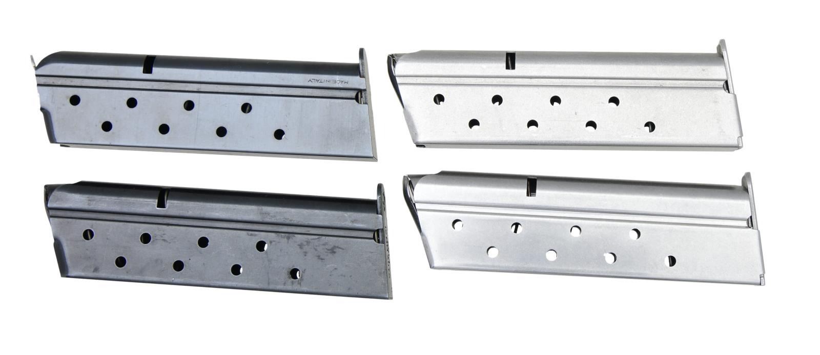 Cal. 10mm Auto. S# DS03745. Bbl. 5" stainless. Mfg. 1989 (1989-1996) with Delta symbol on pebble grained wrap around rubber grips, ring hammer, long smooth faced trigger, grooved arched mainspring housing, short spurred grip safety, high profile blued fixed 3 dot sights plus serrated slide stop and thumb safety. MAGS: 5 TOTAL 8 rd.: 2 Colt stainless Delta marked, 1 Colt stainless rampant Colt marked, 1 Colt marked blued and 1 MecGar blued. CONDITION: all aspects near excellent including bore and grips. (24-1552/NW). MODERN. $800-1,200.
