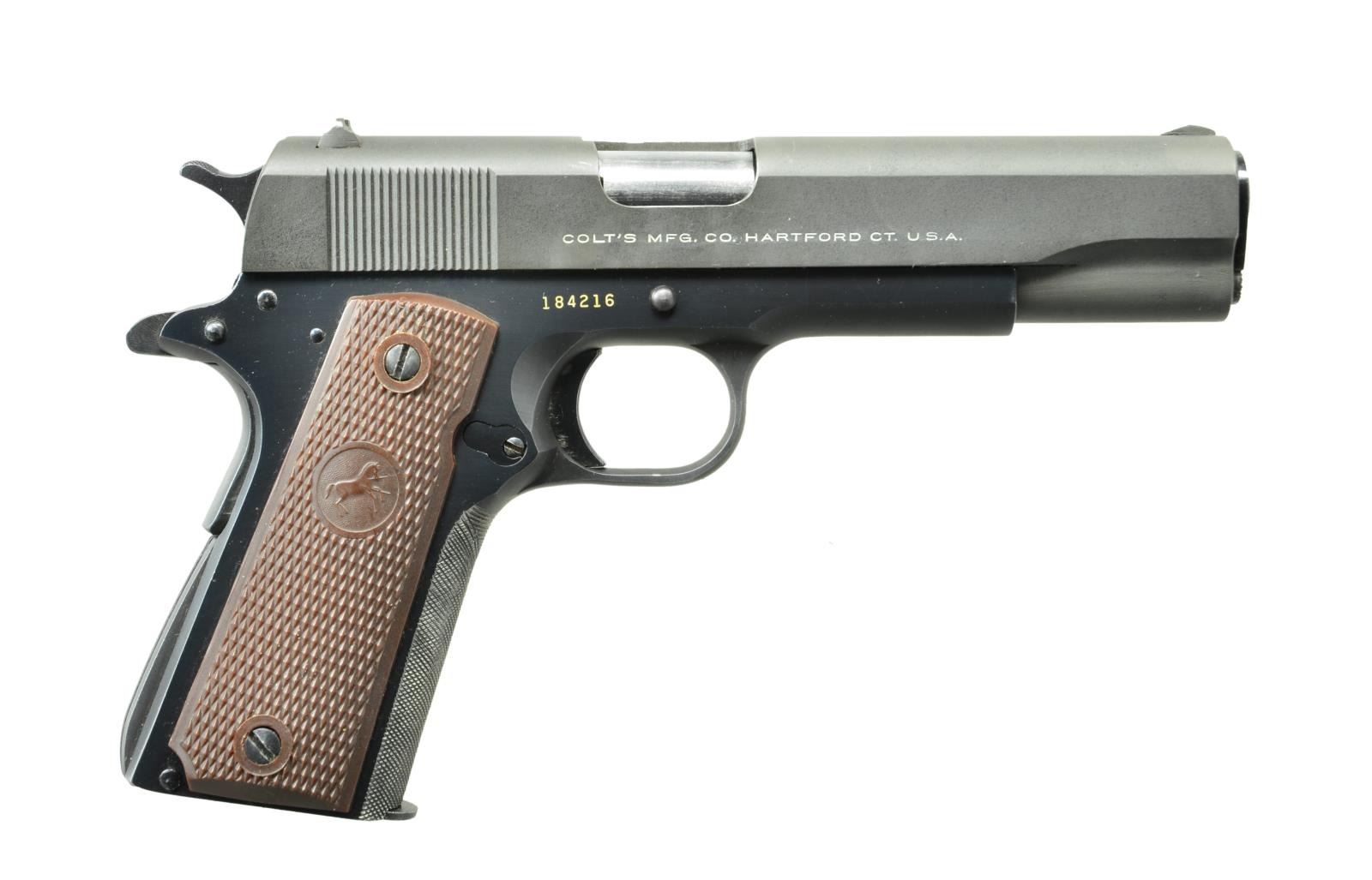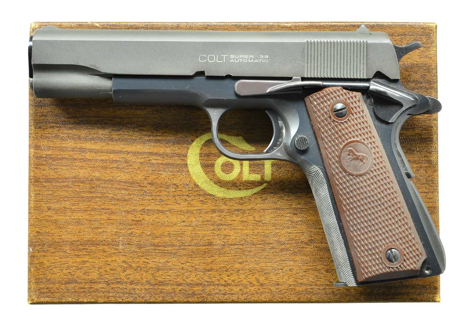 Cal. 38 Super. S# 184216. Colt 5" heavy bbl. w/ out reduced mid point diameter; "825787" electro engraved forward of legs. Mfg. 1966. Blued frame w/ grooved arched mainspring housing, checkered Colt logo brown plastic grips & matte finished fix sight slide. Front grip strap checkered in unconventional cross pattern rather than vertical & horizontal. Aftermarket extended slide lock & ejector. MAGS: 1 Colt marked 9 rd. UNATTACHED ACCESSORIES: appropriate era wood grained 2 piece box having non factory black marker info for Commander #45911-LW plus paperwork to include warranty card for 49538LW & 7-53 LW Commander manual. CONDITION: very good overall as commercially refinished. Frame markings well preserved; rampant colt on slide is faint. Near excellent bore. (22-3581/NW). CURIO. $700-1,000.
