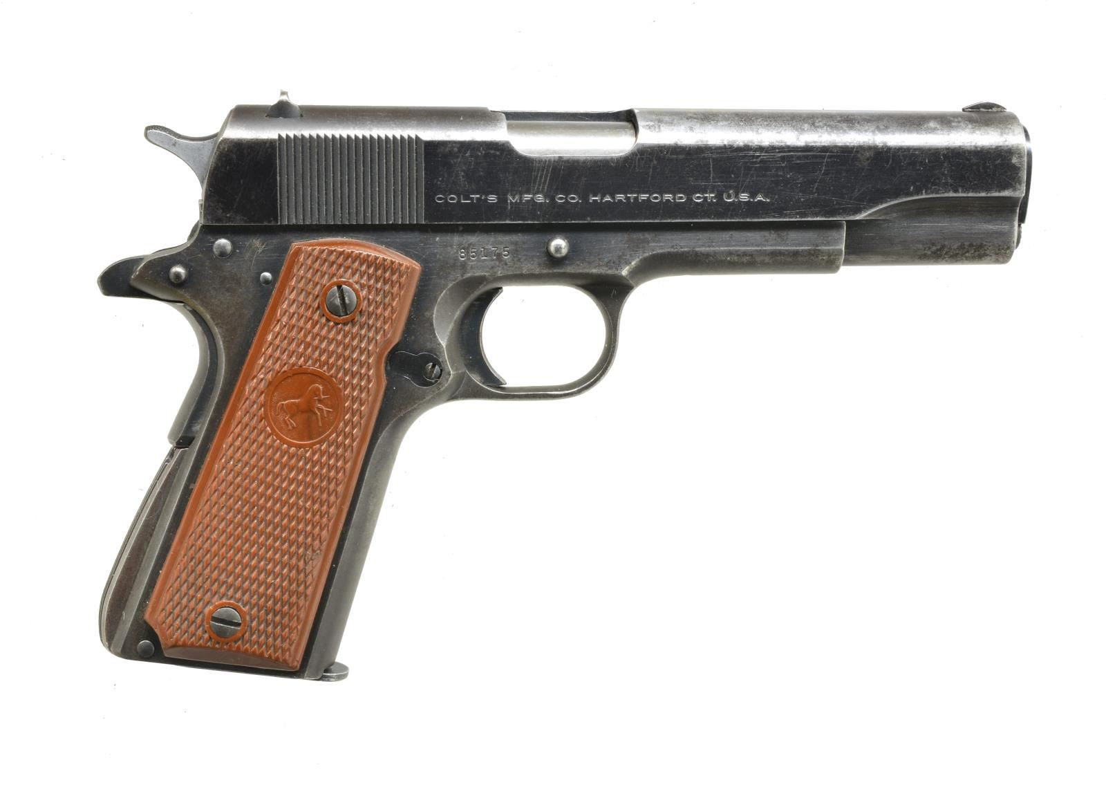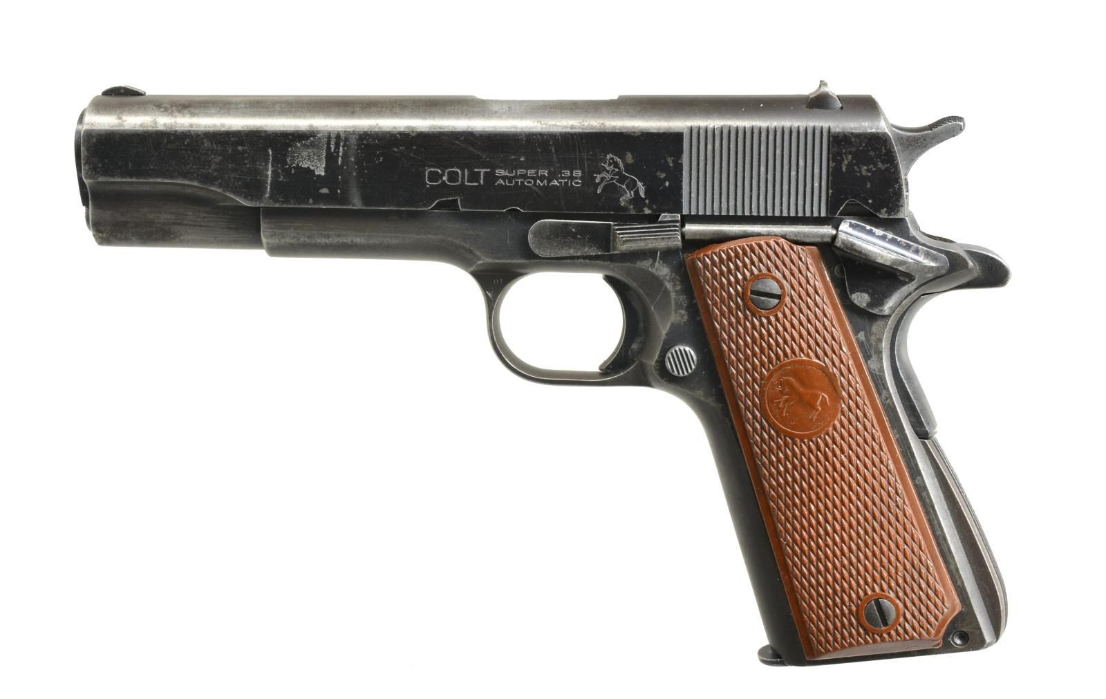 Cal. 38 Super. S# 85175. Bbl. 5". Serrated ramp front sight w/ fixed square notch rear sight. Blue finish. 2 Piece checkered plastic grips. 1950 Mfg. MAGS: 1 detachable 9 rd. CONDITION: 60% dull worn blue blending w/ wear spots & scattered light pitting having a series of sm. dents on right side above trigger. Grips have worn checkering. Bright bore w/ strong rifling. (20-3237/DS). CURIO. $1,000-1,500.