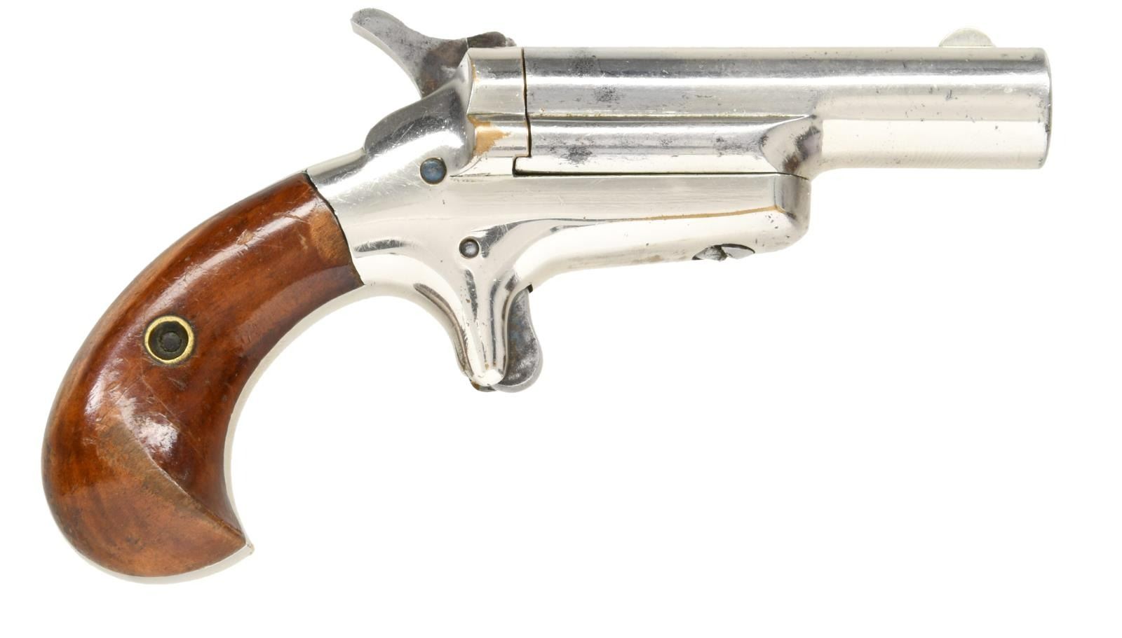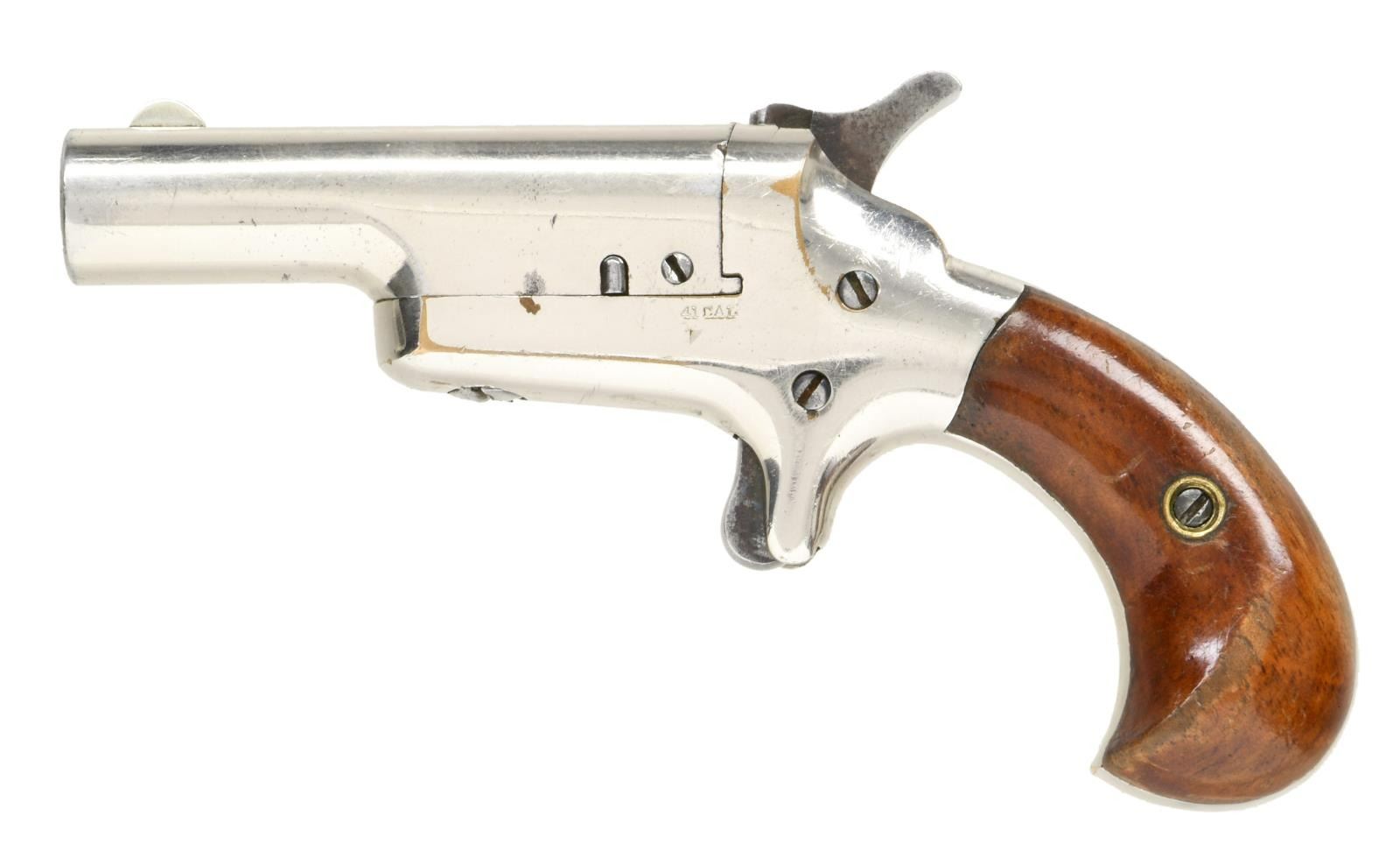 Cal. 41 RF. S#. 4275. Bbl. 2 1/2" with semi circular sight. pivot to the right for loading. Spur trigger action Full nickel finish. 2 piece bird's head wood grips. Approximately 48,000 mfg. 1870-1912. CONDITION: Fine, retaining over 90% nickel. Grips show light wear. Dark bore shows scattered pitting. PROVENANCE: Marshall "Brook" Davis Collection. (01-23551/DS). ANTIQUE. $700-1000.