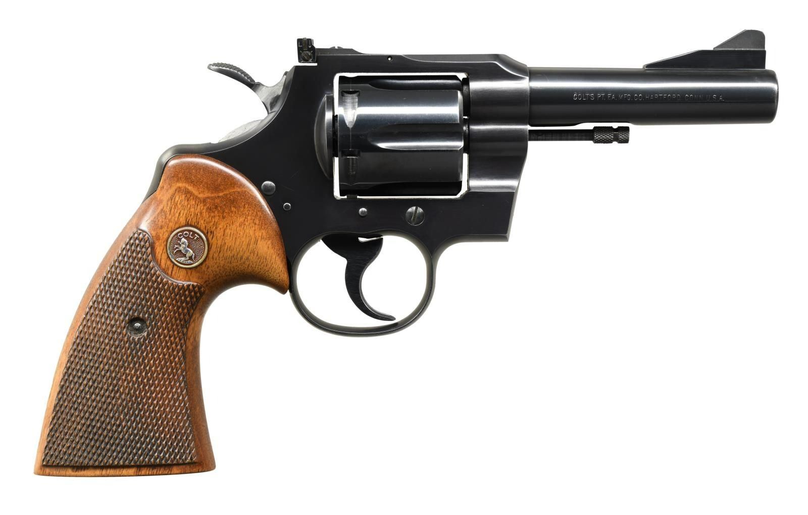 Cal. 357 Mag. S# 65478. Bbl. 4" with serrated ramped blade front sight and frame mounted Accro rear. Mfg. 1967 (1953-1969) with wide spur Python style hammer and satin finished checkered walnut target grips having silver medallions. CONDITION: very good to near excellent finish having very faint occasional spots of pinprick oxidation plus very faint cylinder turn line. Near excellent bore and grips. PROVENANCE: The Collection of Gun Sport Ltd owned by Jon R. Thomas. (23-3922/NW). CURIO. $600-850.