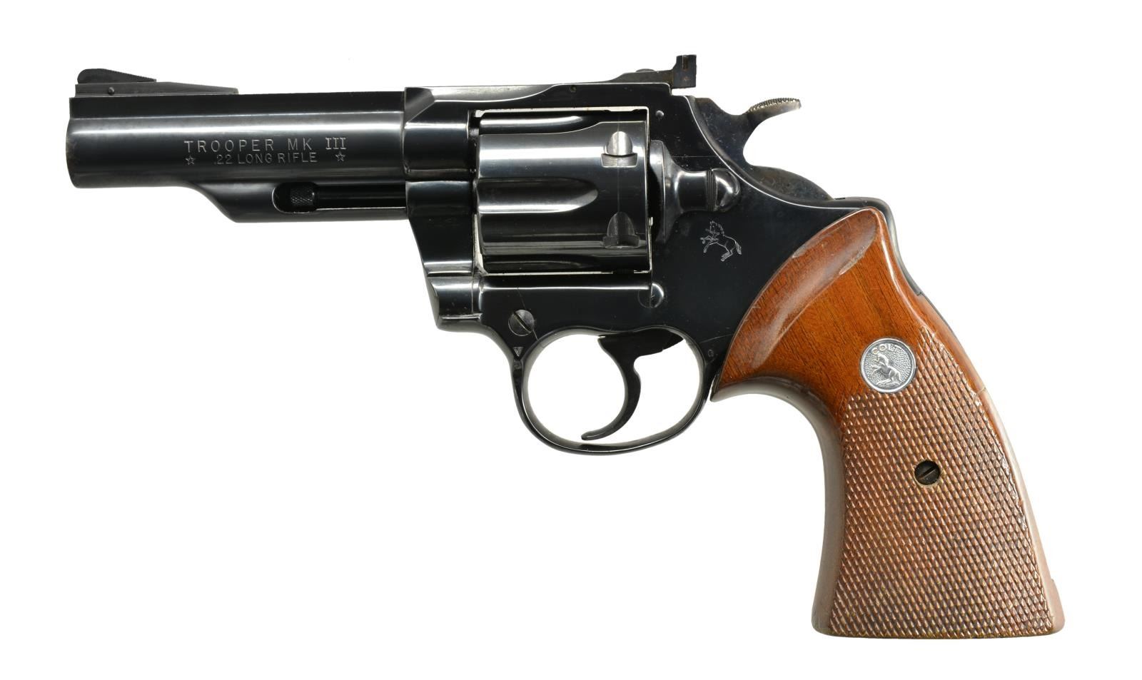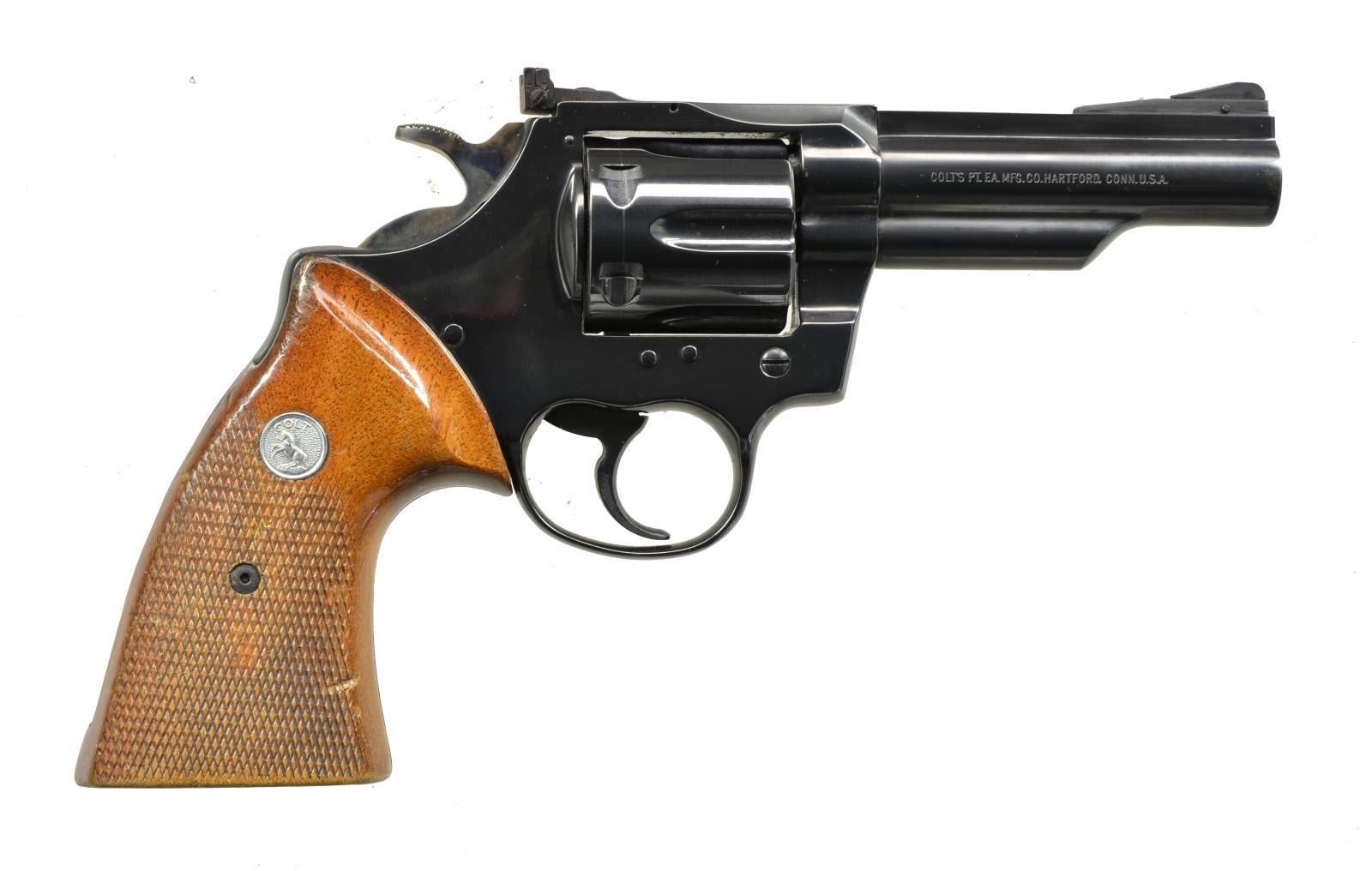 Cal. 22 LR. S# Y8019. Bbl. 4" ribbed w/ serrated ramp front sight & Accro rear. Mfg. 1979 w/ blued finish & checkered walnut target grips having silver Colt medallions. CONDITION: very good plus original finish w/ light cleaned oxidation at muzzle & occasional peppery oxidation. Very good grips. Near excellent bore. (20-2668/NW). MODERN. $500-750.