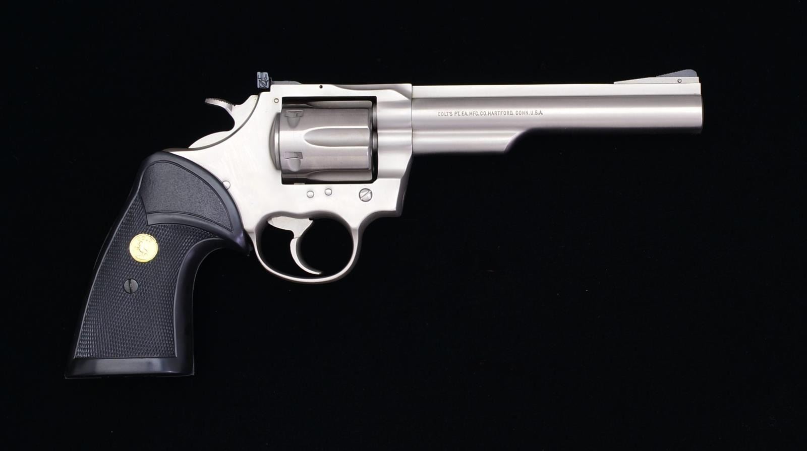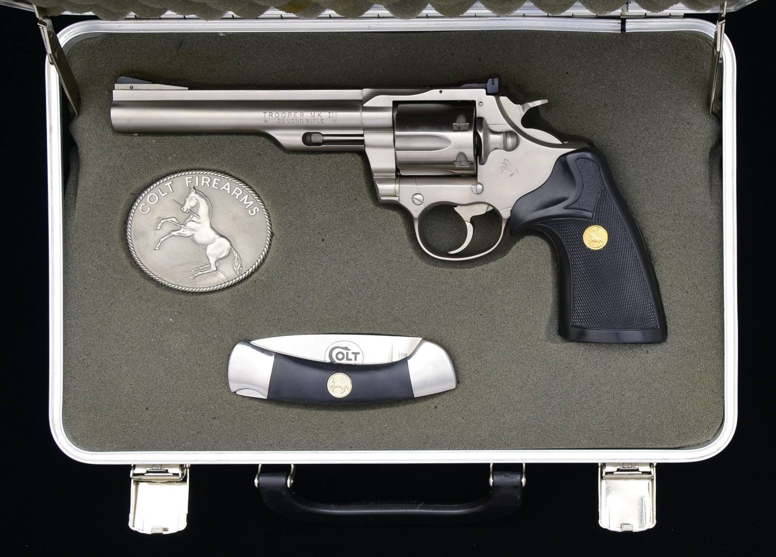 Cal. 22 LR. S# Y18629. Bbl. 6" w/ rib & fully shrouded ejector. Serrated ramp front sight w/ square notch adj. rear sight. Electroless nickel finish. 6 Shot fluted cyl. Pachmayr Presentation grips w/ gold Rampant Colt medallions. 1980 Mfg. One of 150 mfg. by Colt. UNATTACHED ACCESSORIES: kit consists of Colt marked Doskocil pistol case w/ fitted foam interior. Case contains Rampant Colt belt buckle & Boker folding knife w/ 3 1/4" Colt marked blade. Black scales w/ silver Rampant Colt medallion on 1 side. CONDITION: over 98% original finish showing a cyl. drag line. Very good grips. Near excellent bore. (20-4085/DS). MODERN. $1,200-1,800.