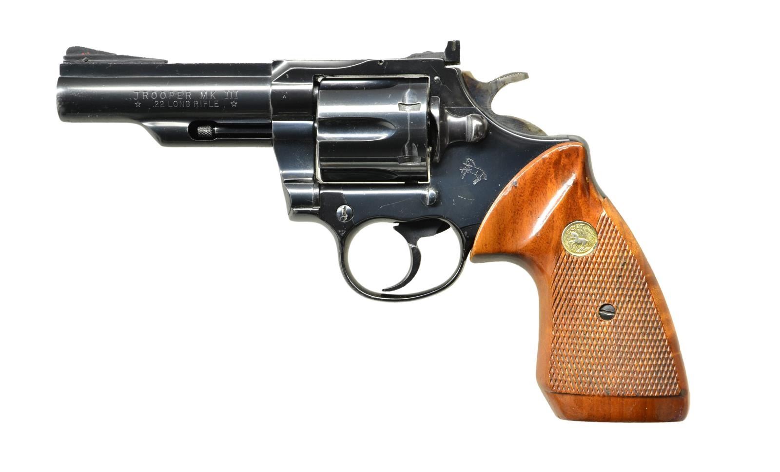 Cal. 22 LR. S# Y19286. Bbl. 4". Ramped serrated front sight. Adj. square notch rear sight w/ added white paint. Mfg. 1980. Checkered Colt grips w/ gold Rampant Colt Medallions. CONDITION: grips show some flaking varnish w/ light dings & handling marks. Metal retains 92% original blue w/ some high edge wear, drag line on cyl. & scattered silvering. Bright near excellent bore. (22-5190/MJC). MODERN. $600-900.