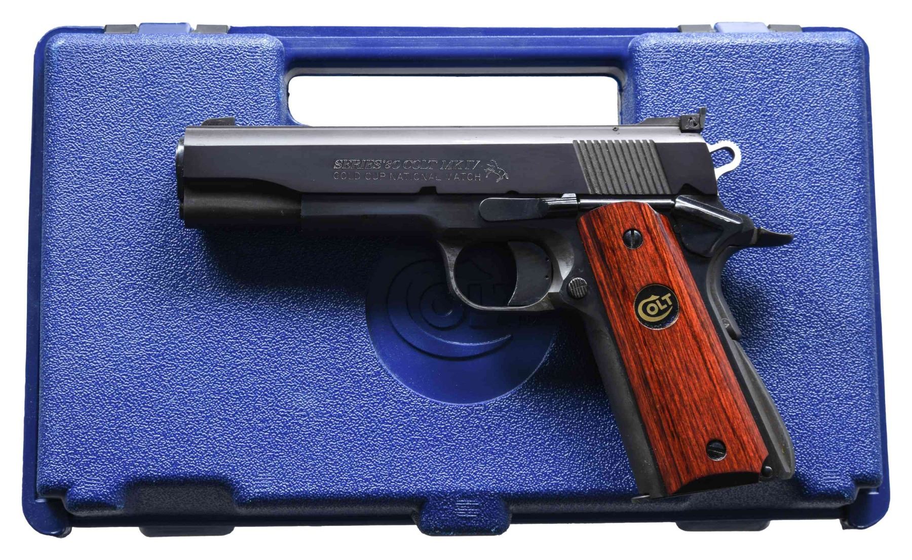 Cal. 45 ACP. S# 238USA. Bbl. 5" marked "-COLT 45 AUTO-". Mfg. 1995 for Lew Horton (500 units listing at $2,699) with Elliason rear sight, square cut cocking grooves on slide, arched grooved mainspring housing, gold accents on right side of slide, long (Government width) serrated trigger with over travel stop, skeletonized hammer, beavertail grip safety and smooth fancy wood grips having gold lettered black Colt medallions. MAGS: 1 factory 7 rd. UNATTACHED ACCESSORIES: factory blue plastic case (unlabeled) with paperwork and hang tag. CONDITION: all aspects near excellent appearing new and unfired. (25-4995/NW). MODERN. $1,000-1,500.