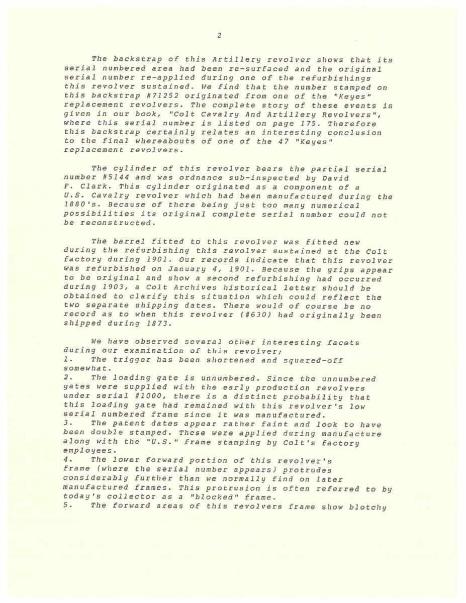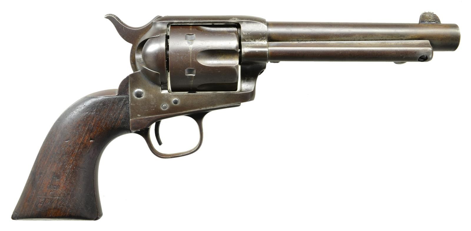 Cal. 45 Colt. S# 630. Bbl. arsenal shortened to 5 1/2" with blade sight. Bbl. has Hartford address. Fluted 6 shot cylinder. Left side of frame is stamped "US". Bottom of barrel has "A" inspectors mark. Back of cylinder has "K" inspepctors inittial. Hammer slot has "C" inspectors initial. Frame is serial number 630, cylinder is number 5144. Trigger guard is number 4372. Backstrap is serial number 71252. Later style ejector head. Trigger is intentionally shortened. 1 Piece walnut grips. Bottom of both panels have "RAC" inspectors marks referring to sub inspector Rinaldo A. Carr. Right panel has 1903 date over illegible cartouche. Many of the original 7 1/2" Cavalry models were returned to the arsenal beginning in 1895 for refurbishing. Barrels were shortened to 5 1/2" and they were reassembled with mixed serial numbers. These guns became known to collectors as Artillery Models as many were issued to Artillery units during the Spanish-American War. Mfg. 1874. CONDITION: metal finish has faded to a pleasing mottled brown patina. Grips have age darkened appearance showing heavy wear and handling marks. Bright bore retains strong rifling. Action is in time. (01-21606/DS). ANTIQUE. $2,500-3,500.
