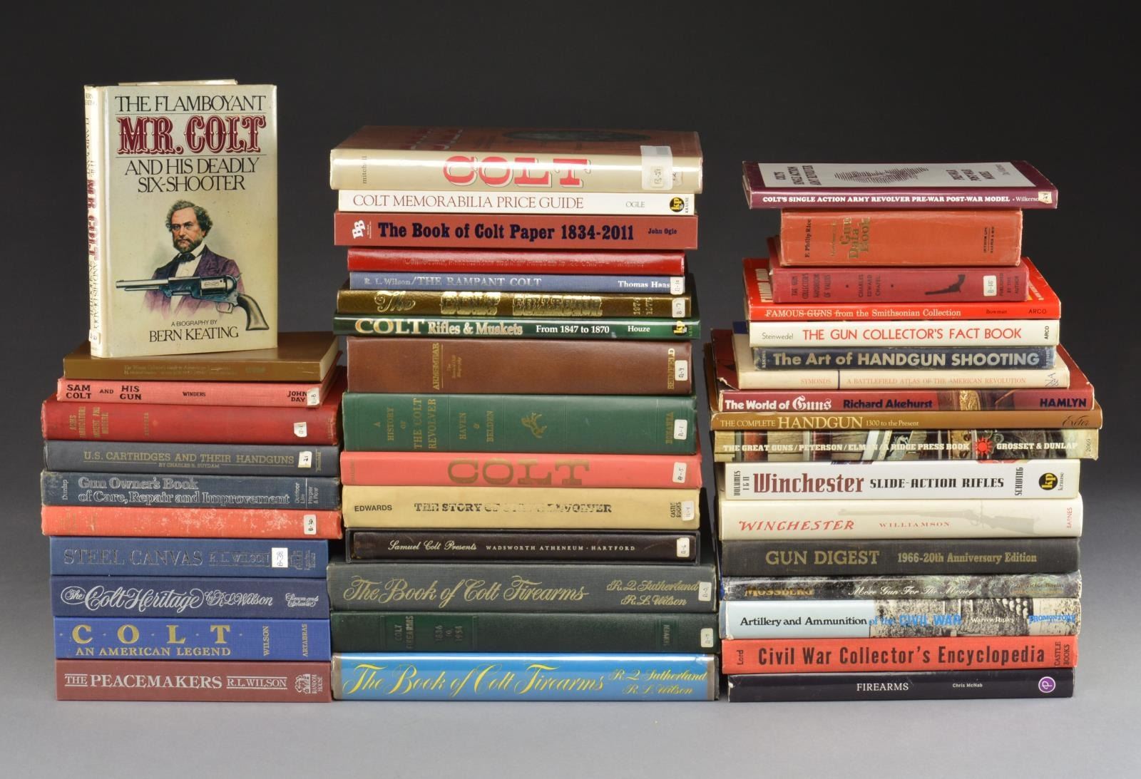 REFERENCE & COLLECTIBLE BOOKS. Notable items include: "History of the Colt Revolver" by Haven & Bolden Armsmear Beinfeld Publishing. / "Colt Firearms" by Serven. / "The Book of Colt Firearms" by Sutherland & Wilson. / "Samuel Colt Presents" by Wadsworth Atheneum, slip cased. / "Colt, the man, the arms, the company" by Mitchell. / "The Peacemakers" by Wilson. / "The Colt Collector" 91 of 105 signed by editors. / "The Colt Heritage" by Wilson. / "Winchester" by Williamson. / "Cast Iron Toy Pistols" by Best. / "Artillery & Ammunition of the Civil War" by Ripley. / "Arms Fabrication Ancient and Modern" by Gardner. / "Art of Handgun Shooting" by C. Askins Jr. / Group also includes dust covers removed from books. CONDITION: ranges from good to very good w/ light wear, staining & scuffing. PROVENANCE: The Estate of Richard Willman. (02-14141/RW). $300-500.