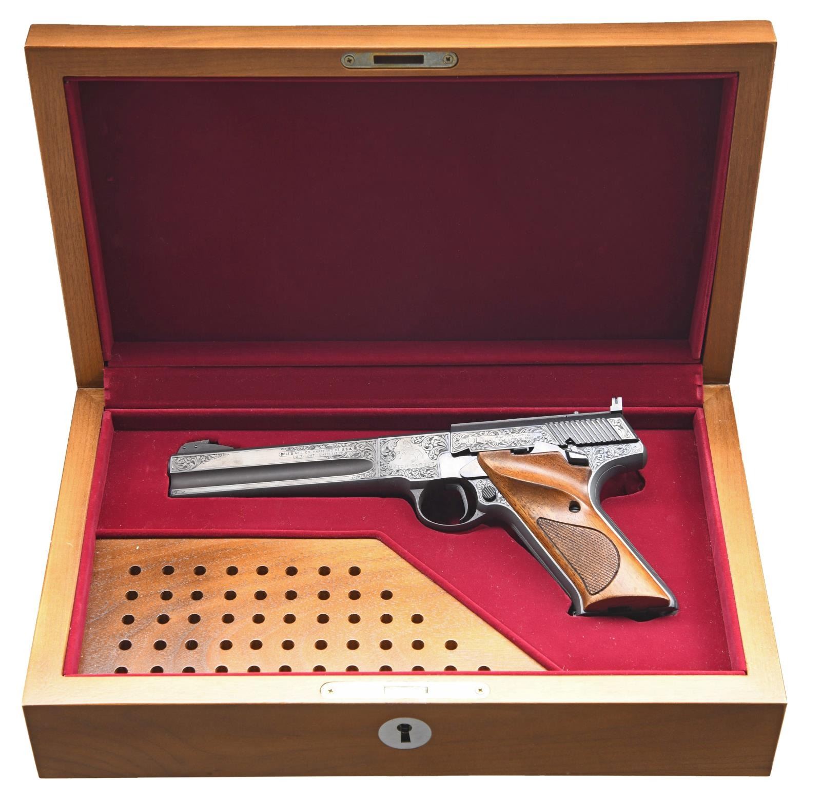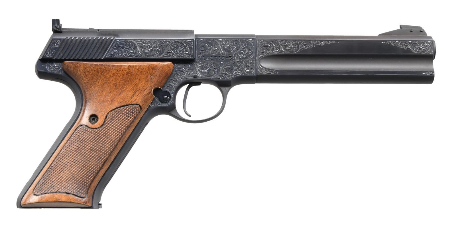 ENGRAVED PISTOL. Cal. 22 LR. S# 142769-S. Bbl. 6" w/ full lug. ramp mounted Patridge front sight w/ adj. square notch Accro rear sight. Frame, slide & bbl. have 50% coverage of fine hand engraved foliate scroll w/ punch dot backgrounds by Thomas J. Kaye with "TJK" at left rear of frame. "Tommy" was a founding charter member of the Firearms Engravers' Guild of America in 1981 and was most prolific in 1980's and 1990's (1938-2015). Standard Colt checkered RH thumbrest walnut grips (likely replacements; originals were checkered plastic). Mfg. 1955. MAGS: 1 Detachable factory 10 rd. UNATTACHED ACCESSORIES: letter from the Office of the Colt Historian detailing the following information, "Serial Number: 142769-S / Caliber: .22/c / Barrel Length: 6" / Finish: Blue / Type of stocks: Not Listed / Shipped To: Kruse Hardware Company / Address: Sixth & Baymiller Street Cincinnati, Ohio / Date of Shipment: May 17, 1955 / Number of Same Type Guns in Shipment: 3. Colt marked walnut presentation box w/ red velour fitted interior & 50 rd wood cartridge block. Case key is included. Very good original brown hinged box with green interior; no number on box but correct label. Original test target and 1-54 dated manual (both oil stained) plus blued Colt 3 bladed key chain screwdriver and factory serrated brown plastic arched back strap adapter. CONDITION: over 99% fine quality reblued finish. Light hand wear to grips. Bright near excellent bore. PROVENANCE: from the Collection of Gun Sport Ltd. owned by Jon R. Thomas. (23-3892/DS). CURIO. $1,750-2,750.