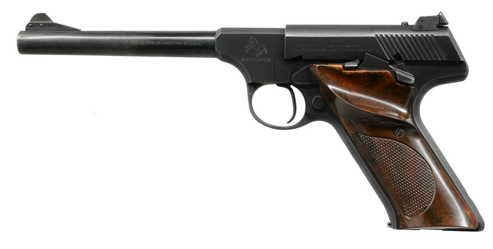 PISTOL. Cal. 22 LR. S# 23358-S. Bbl. 6" ramped serrated blade sight plus ColtMaster adjustable rear on slide. Mfg. 1948 (1947-1955) with push button mag. release, grooved angled trigger, auto hold open and brown wood grained Coltwood plastic grips havinf RH thumb rest. MAGS: factory 10 rd. with alloy follower and loading button; 2 line floorplate. CONDITION: very good general appearance with some thinning finish to include bottom of barrel (with touch up blue) and grip straps. Near excellent bore and grips. (23-1497/NW). CURIO. $450-650.