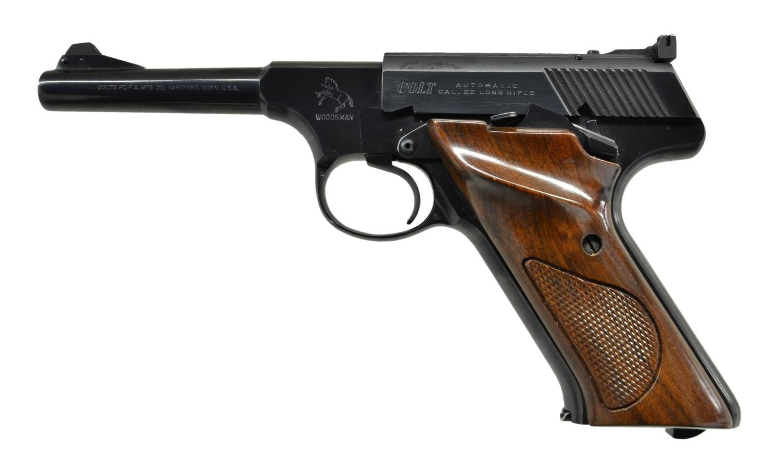 Cal. 22 LR. S #081846S. Bbl. 4 1/2". Sport model w/ shorter bbl. Serrated blade ramp front sight. Accro rear sight. Mfg. 1975. Bottom mag release. Thumb rest grips. MAGS: 1-10 detachable. UNATTACHED ACCESSORIES: Two piece styrofoam Colt box. CONDITION: grips show a couple dings & light handling marks. Metal retains 95% original blue. Very good plus bore. (22-3577/MJC). MODERN. $500-800.