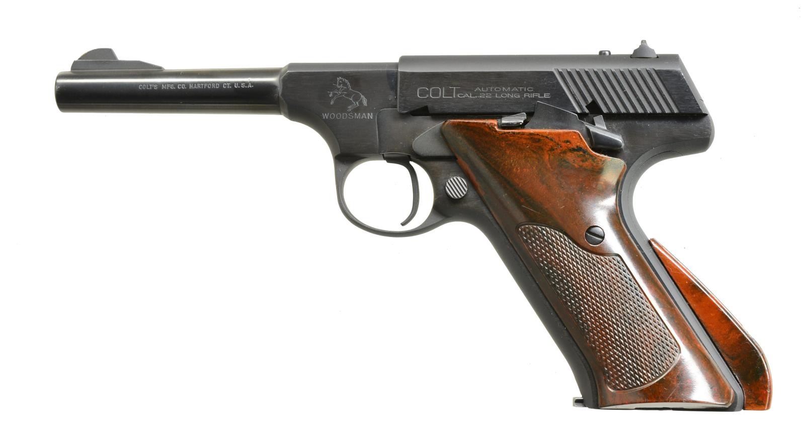 PISTOL. Cal. 22 LR. S# 52552-S. Bbl. 4 1/2" w/ ramp mounted blade front sight & square notch rear sight. Mag. release is located on left side of frame. 2 Piece checkered plastic grips w/ matching extension on backstrap. 1950 Mfg. MAGS: 1 detachable 10 rd. CONDITION: over 98% blue. Very good grips. Bright bore w/ strong rifling. (20-3329/DS). CURIO. $500-800.