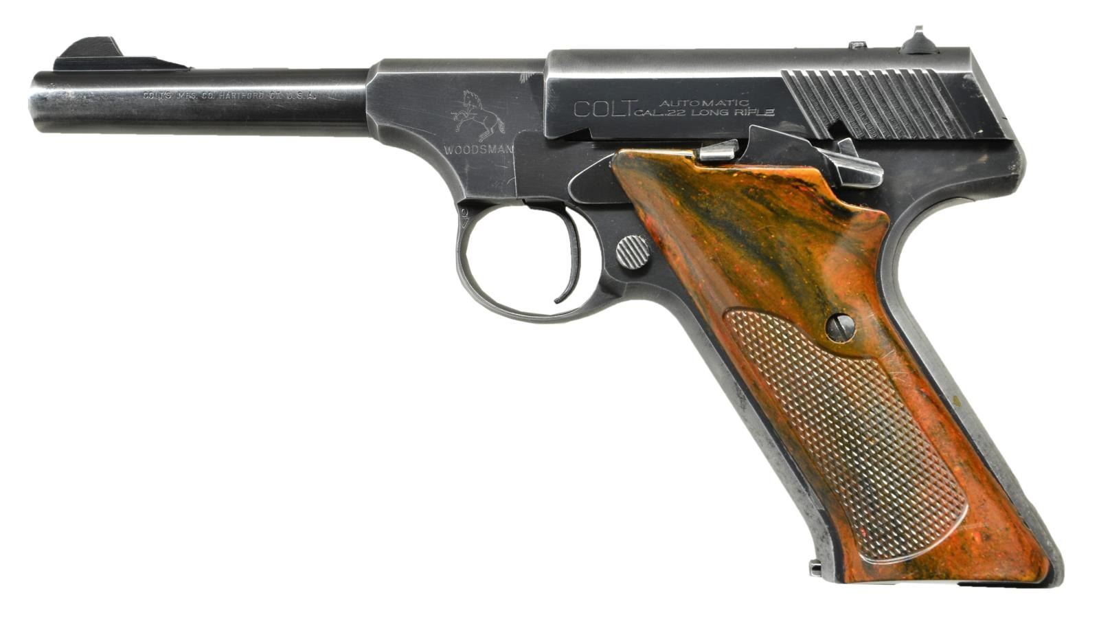 PISTOL. Cal. 22 LR. S #69495-S. Bbl. 4 1/2". Notch rear sight. Ramp mounted blade front sight. Mag. release on left side of frame. Front strap marked "RJB" in electro pencil. 2 Piece checkered plastic grips w/ rampant Colt on right panel. MAGS: 1-10 rd. marked "COLT CAL. 22 LR" on base plate. UNATTACHED ACCESSSORIES: Brauer Bros. right handed leather belt holster. CONDITION: grips show a couple sm. chips, light scratches & handling wear. Metal retains 60% original blue w/ high edge wear & both straps faded to gray w/ oxidation staining. Very good bore. (22-2758/MJC). CURIO. $350-550.