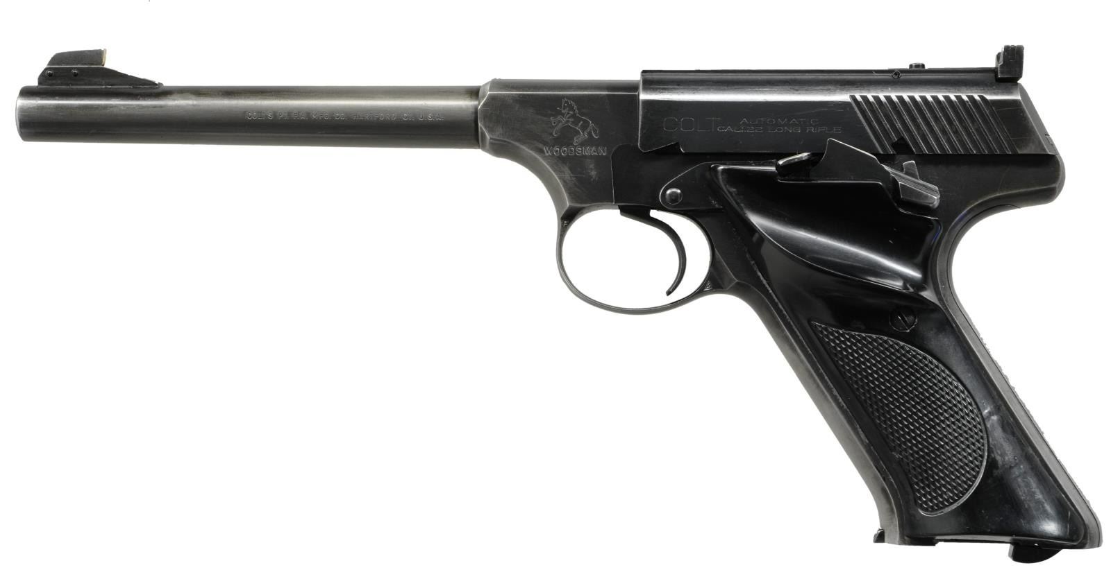 Cal. .22 LR. S# 164878-S. Bbl 6". Woodsman manufactured by Colt in 1956. Left side of barrel bears Colt's single line addressed followed by the Rampant Colt logo above "WOODSMAN", with "COLT" followed by the caliber designation on the left side of the slide. Metal components are blued, with the frame being mounted with 2 piece Colt checkered black plastic grips. Fixed front sight with adjustable square notch rear sight. CONDITION: metal components exhibit wear and thinning overall that shows through to gray patina and a few spots of light surface oxidation. Underside of frame (ahead of the trigger guard) and underside of barrel exhibit markings from what appears to have been an attempt to removal the barrel. Mirror bore, exhibiting strong rifling throughout. Grips exhibit scattered handling marks, but are otherwise sturdy and serviceable. (23-1762/MLW). CURIO. $350-550.