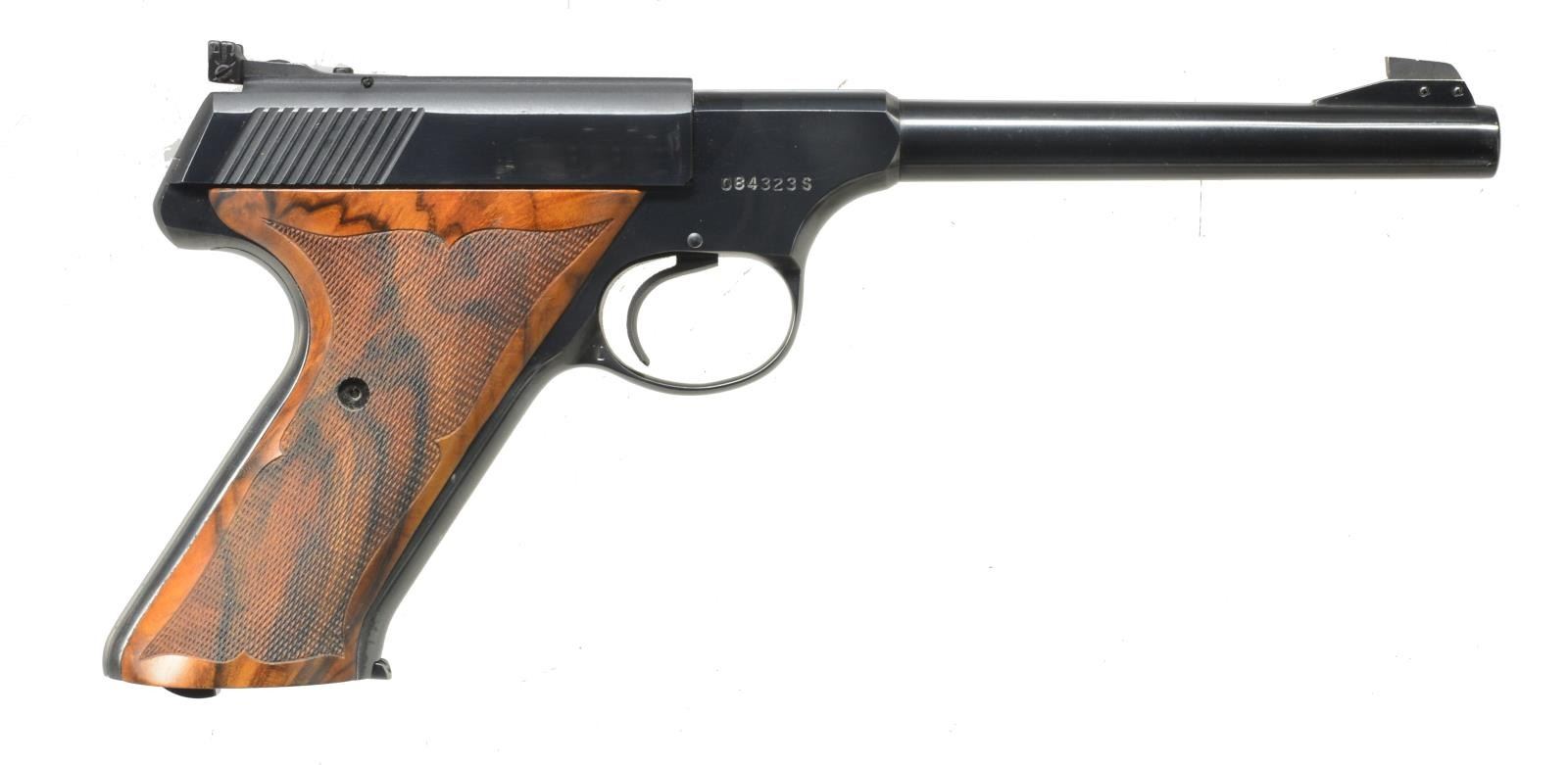 PISTOL. Cal. 22 LR. S# 084323S. Bbl. 6" w/ ramp mounted Patridge front sight & square notch adj. rear sight. Bright blue finish. Custom thumb rest grips of fancy walnut w/ 22 line per inch fancy borderless hand checkering. 1972 Mfg. MAGS: 1 detachable 10 rd. CONDITION: 97% blue. Grips have very good gloss finish. Smooth mechanics. Bright bore w/ sharp rifling. PROVENANCE: From the Frederic W. Thrane Collection. (20-2438/DS). MODERN. $600-900.
