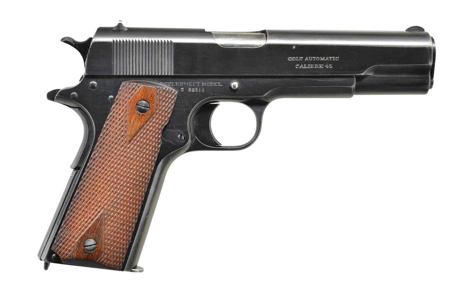 Cal. 45 ACP. S# C 88611. Bbl. 5" marked "COLT 45 AUTO" above left leg plus "P" on left leg and in front of legs. One of 25 firearms shipped to Abercrombie & Fitch on March 6, 1917 per Oct. 2013 factory letter. Frame has "S" & "8" by disconnector. "VP" proof on left front of trigger guard plus "8" at rear. "Z" under firing pin retainer plus "P" by disconnector slot in slide. Checkered slide stop and thumb safety; both with milled undercut. Checkered walnut double diamond grips. Tapered blade front sight and U notched rear. Flat mainspring housing with lanyard loop. Bottom of firing pin retainer is not beveled. MAGS: 1 good unmarked two toned 7 rd. UNATTACHED ACCESSORIES: factory letter mentioned above. CONDITION: very good to excellent with factory quality refinish. Right side of slide has small spot above "Colt" plus a dip in the demarcation line separating rounded top and flat side near front. Very light thinning on frontstrap and high points. Very light scratch from typical improper slide stop installation. Near excellent grips; light wear on screws. Very minimal barrel finish loss and near excellent bore. (22-3110/NW). CURIO. $1,000-1,500.