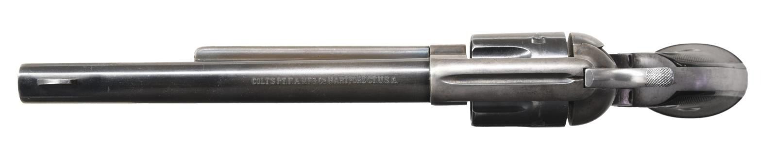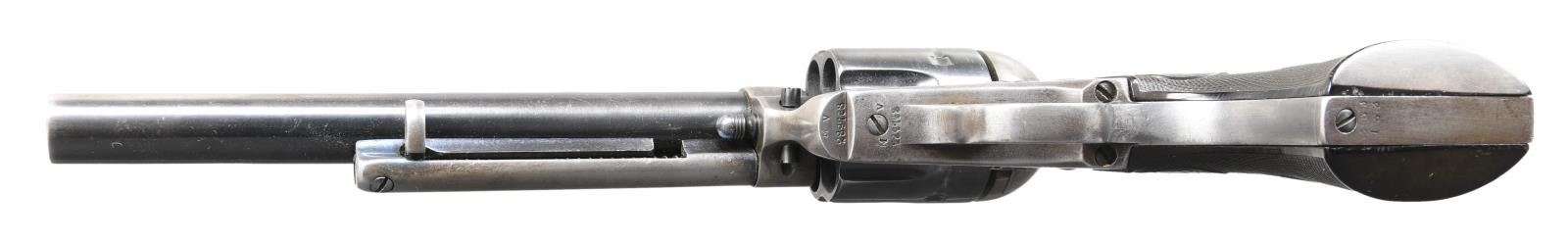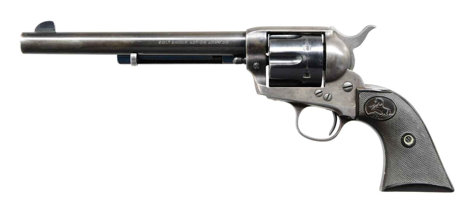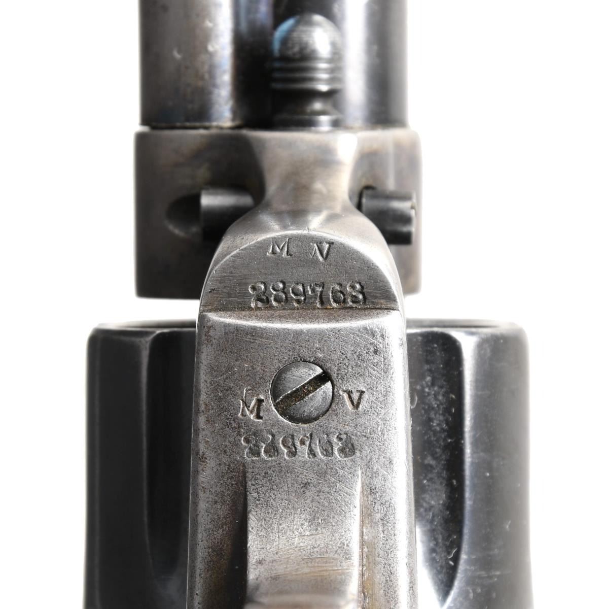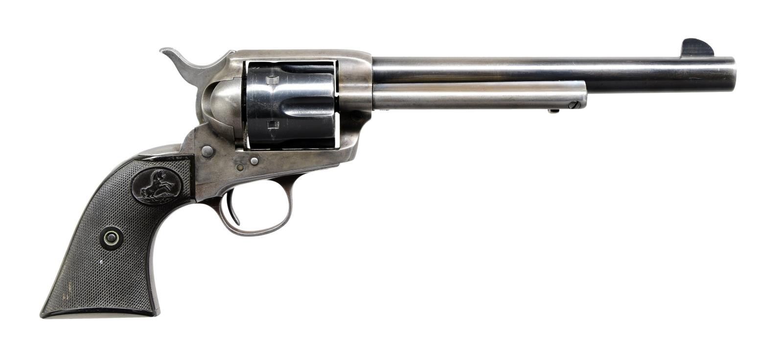 Cal. 45 Colt. S# 289763. Bbl. is 7 1/2" replacement with blade front sight. 6 shot fluted cyl. Blued cyl., bbl., grip frame & ejector rod housing. 2 Piece checkered hard rubber Rampant Colt grips. Spurious "US" marking on left side of frame & on cyl. "M" & "V" markings stamped on bottom front of frame & grip frame. CONDITION: bbl. retains approx. 60% original blue with thinning & minor scattered handling marks. Remaining metal parts have been lightly polished & refinished with overall rounding of sharp edges & areas of scattered light pitting & freckling. Grips show moderate wear with scattered light handling marks & appear slightly undersized on front strap area. Bright shiny bore with crisp rifling. Mechanically sound. A nice shooter grade 1st gen SAA. (24-1319/BH). CURIO. $1,200-1,600