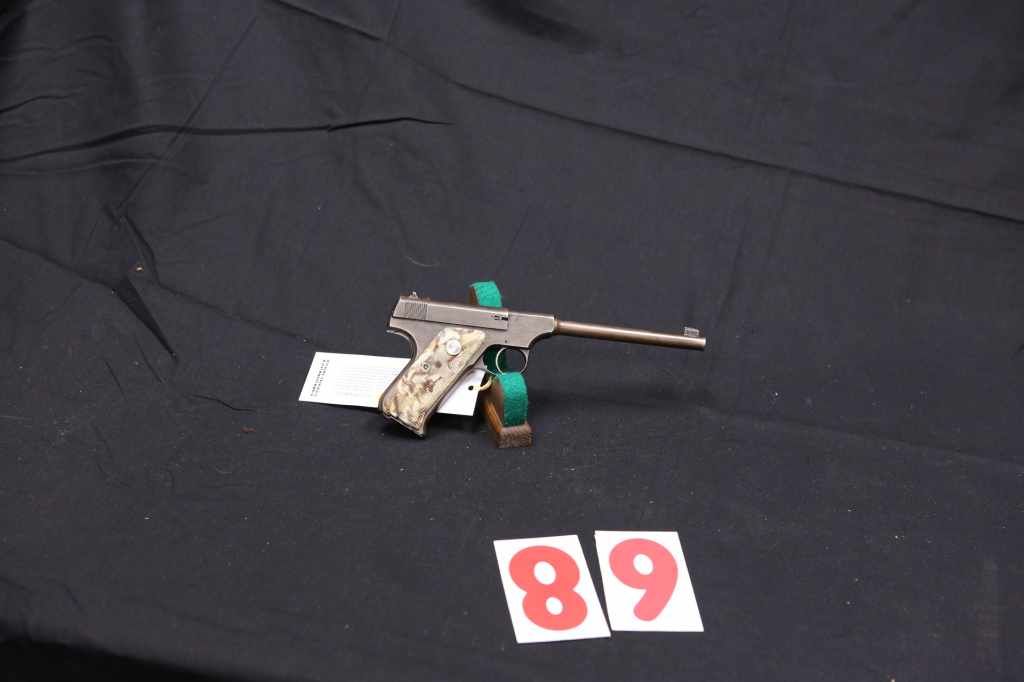 COLT, "PENCIL BARREL PRE-WOODSMEN" IN 22 CAL. LIGHT TRACES OF ORIGINAL BLUE SHOWING. CORRECT COLT MAG. REPLACEMENT GRIPS. (H) A6611, 17120