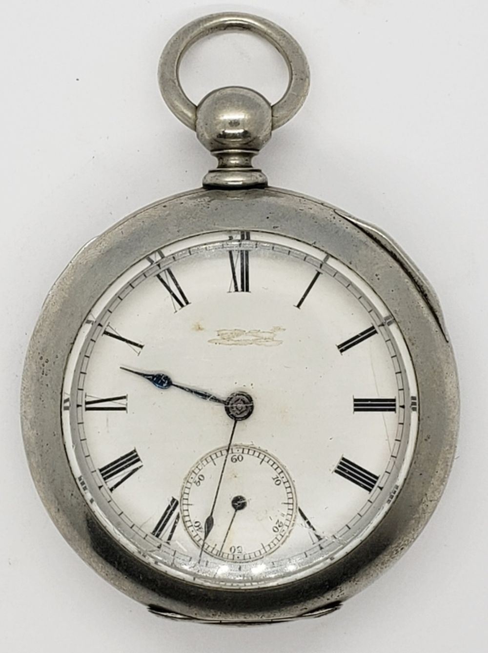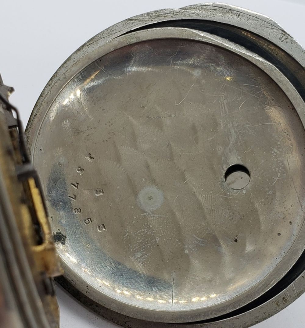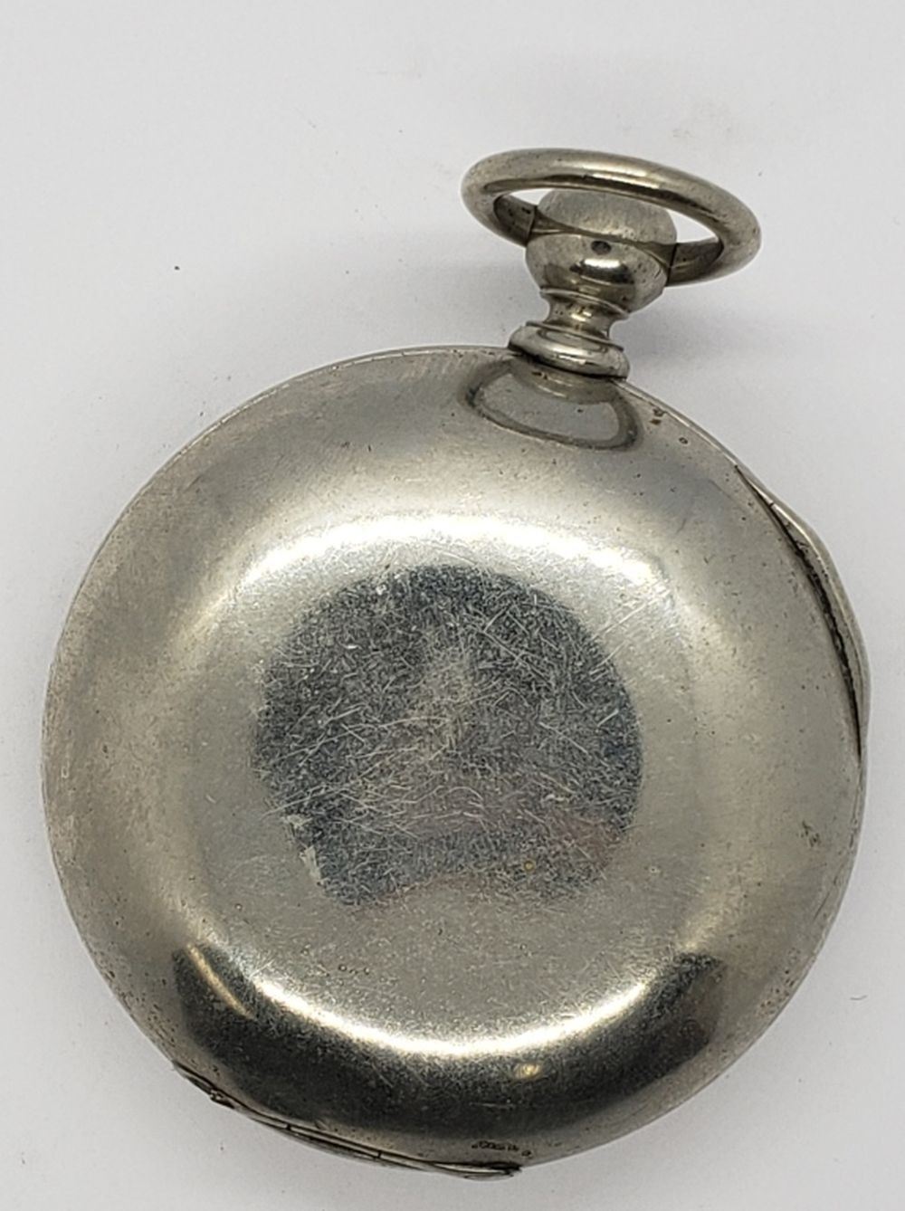 POCKET WATCH CIRCA 1896-1899, KEY WIND (HAS KEY), SILVERINE CASE, RUNS but NEEDS CLEANED, FACE has had NAME SCRATCHED OFF otherwise SOLID CONDITION