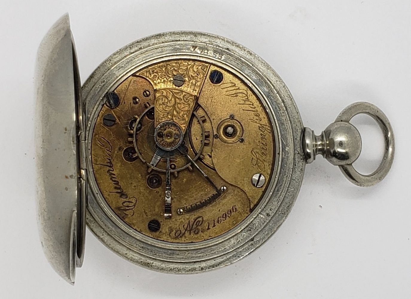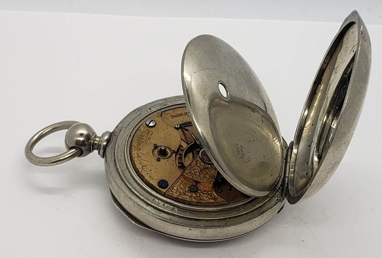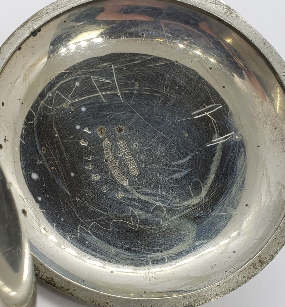 POCKET WATCH CIRCA 1896-1899, KEY WIND (HAS KEY), SILVERINE CASE, RUNS but NEEDS CLEANED, FACE has had NAME SCRATCHED OFF otherwise SOLID CONDITION