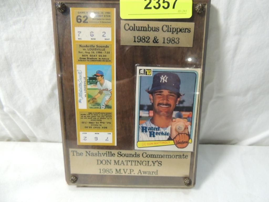 THE NASHVILLE SOUNDS COMMEMORATE DON MATTINGLYS 1985 MVP AWARD. CLUMBUS CLIPPERS 1982 & 1983 PLAQUE. TICKET AND BASEBALL CARD. AS SHOWN. SEE PHOTO FOR MORE DETAILS.