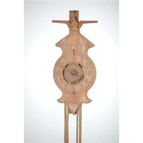 COLUMBUS CLOCK IN ORIGINAL BOX - WOODEN WHEELED 1-DAY<BR>WEIGHT DRIVEN TIMEPIECE W/ EMBOSSED WOODEN DIAL W/<BR>PORTRAIT & 1492 & BOX W/ ORIGINAL LABEL W/ RETAILER &<BR>INSTRUCTIONS (CIRCA 1890'S)(14" T X 5.5" W X 4.5" D-<BR>CLOCK ONLY) - WEAR, IMPERFECTIONS
