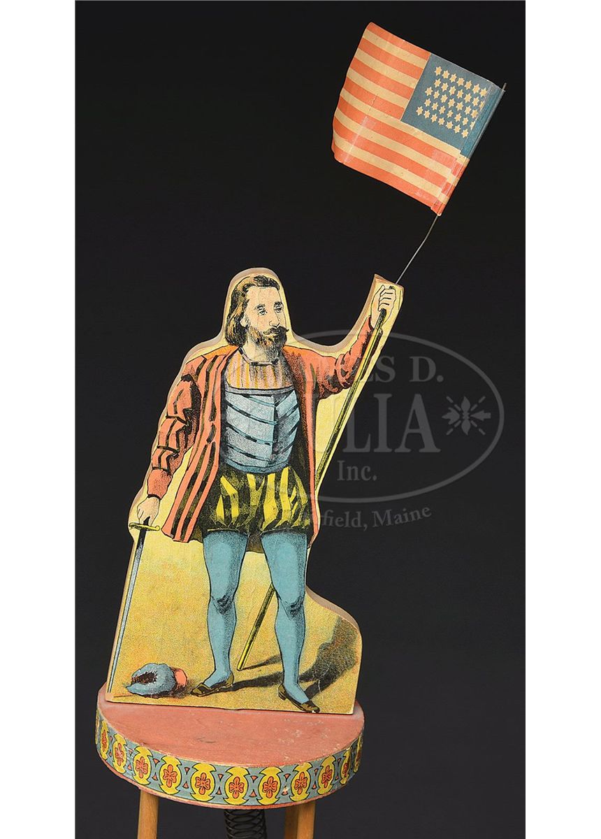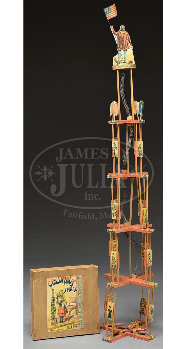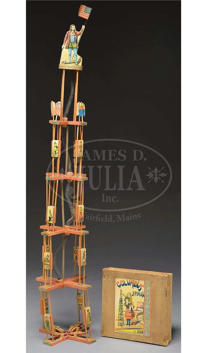 An amazing paper on wood toy with this being the only known example in remarkable condition with its original box. At the time period this must have been quite a complicated toy for a young child to assemble, obviously parental help would have been needed. It stands an amazing 5 foot plus high to the top of Columbus's flag (not original to toy). When a marble or wooden ball is dropped down through the spring type tubing it cascades about, finally reaching the lower level and hitting one of the comical see-saw figures. It is hard to believe that over the years pieces of this toy did not become separated or lost! About the various levels are lithographed blocks with lettering on one side and figures on the other. The various wooden platforms also have a bevy of lithographed paper with lettering. A somewhat fragile and delicate toy and yet visually and ascetically quite pleasing to the eye. One can imagine that this toy, due to its complexity and frailty, was not a commercial success thus it is quite evident why this toy is so obscure/rare and highly sought after by collectors. Adding to the allure of this toy is the fact that the Olins purchased it from renowned toy collector and ATCA member Herb Siegel. To put it in simple terms, this is a "once in a blue moon" opportunity. SIZE: 5 feet. PROVENANCE: The Diane and late Steve Olin collection. CONDITION: Overall exceptional original condition with paper largely intact. Most noteworthy is some distress to one flag on upper level and Columbus lacking tiny piece of wood on hand to keep flag in place. Coloring is vibrant and strong and this toy appears to have had very little use and/or exposure to the sunlight. 1-13274
