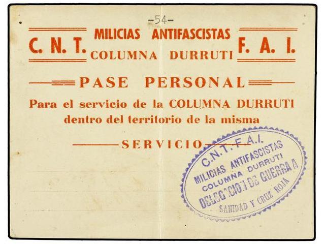 COLUMNA DURRUTI. PASE PERSONAL PARA EL SERVICIO. Sello óvalo en violeta de la Columna Durruti C.N.T.-F.A.I. Sanidad y Cruz Roja. Al dorso COMITÉ DE BUJARALOZ. RARO. MBC.