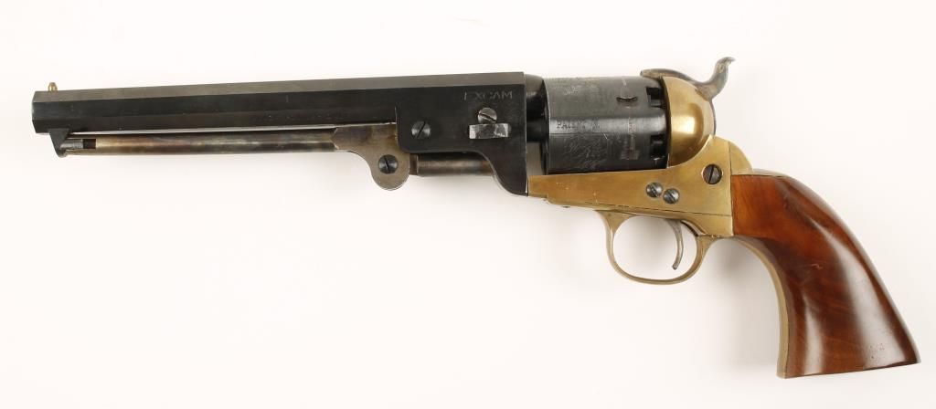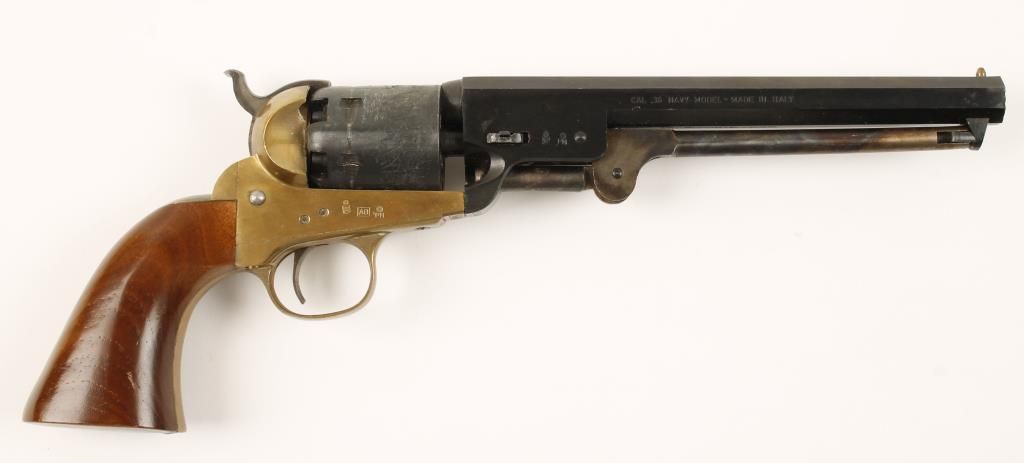 Replica black powder single action 6-shot pistol. 7-1/2" blued octagon barrel. Case colored loading lever, hammer and trigger. Blued and roll-stamped cylinder showing a naval engagement. Brass frame, trigger guard and backstrap. Not cut for a shoulder stock. Condition is good. *Antique Firearm*