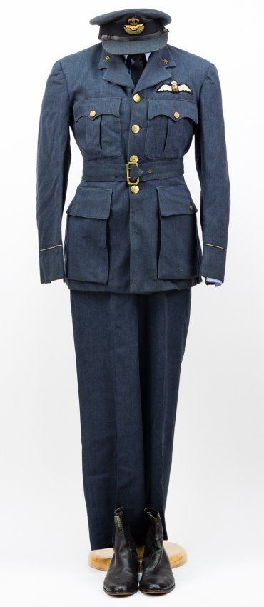 A rare and important grouping, the uniform of R.A.F. Battle of Britain Spitfire pilot and "ace", Pilot Officer Walter Beaumont D.F.C., along with his personal R.A.F. flying manual. Beaumont would lose his life defending his country during the Battle of Britain. The group includes Beaumont's R.A.F. tunic with belt, matching pants, identified R.A.F. "crusher" visor cap, and zip-up black leather ankle boots, with later blue shirt and clip-on black tie included for display purposes. Beaumont's tunic, an early version, bears flat service-issue wings with "VR" ("Volunteer Reserves") insignia and cloth R.A.F. wings on the left breast. The lighter-colored fabric, large bottom pockets and "first aid" pocket mark this as an early tunic. An interior breast pocket bears the tailor's label of: "Alkit Ltd. Outfitters London" with Beaumont's name, jacket size, order number, and date of issue:"11/39". Cuffs bear the single stripe indicative of rank. Within, the cotton lining, also indicative of an early tunic, is worn at the armpits commensurate with use. The tunic belt is also present, although it appears that Beaumont opted for an inner hook and eye system. Beaumont's use of an inner belt was intended to prevent an exterior belt from hanging-up on a parachute harness or restraining belts in flight. That fact, coupled with two small areas of wear on the front of the tunic possibly caused by a parachute quick-release buckle, make a good case for this tunic having been worn in flight. The matching blue uniform trousers show the same amount of wear, and are also very good. Also present is Beaumont's wool R.A.F. officer's visor cap with ornate gold bullion with red satin and gold eagle insignia, with his name affixed to the leather sweatband within. Finally, included is Beaumont's signed copy of the: "Royal Air Force Flying Training Manual Part I Flying Instruction" [London: Air Ministry (His Majesty's Stationery Office)], 1935. approx. 250pp. 8vo., illustrated. The front cover bears an aged piece of paper upon which Beamont affixed his name. Provenance: From the collection of the late Malcolm Smith, the long-time assistant secretary to the Battle of Britain Association; The War Museum. Walter Beaumont was born in Dewsbury, Yorkshire in 1919 and from January 1937 was a member of the R.A.F. Volunteer Reserves. Called up on Sep. 1, 1939, he completed his training and joined 152 Squadron early in 1940. On Aug. 12 Beaumont shared a Bf 109 and damaged two Ju 88s, on the 16th he claimed two Bf 109s destroyed, on the 18th two Ju 87s and a shared Bf 109, on the 22nd a Ju 88 shot down, on the 25th another Bf 109 and on the 27th he shared in the destruction of a He 111. On this day Beaumont was hit by return fire from a Ju 88 and baled out safely. On Sep. 23, 1940 at the height of the Battle of Britain, Beaumont failed to return from an operational sortie. His Spitfire, R 7016, is believed to have crashed into the Channel, cause unknown. Beaumont, 26 years old, was posthumously awarded the D.F.C. Oct. 22, 1940. Provenance: the collection of the late Malcolm Smith, the long-time assistant secretary to the Battle of Britain Association; The War Museum, New York.