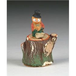COMICAL VEGGIE MAN ATOP TREE TRUNK. A top-hatted veggie man is looking forward in a cross-eyed manner with a frown on his face. SIZE: 3 3/4” t. CONDITION: Chip to bottom area of tree stump; otherwise good to very good. JL 1-3738 (350-450)