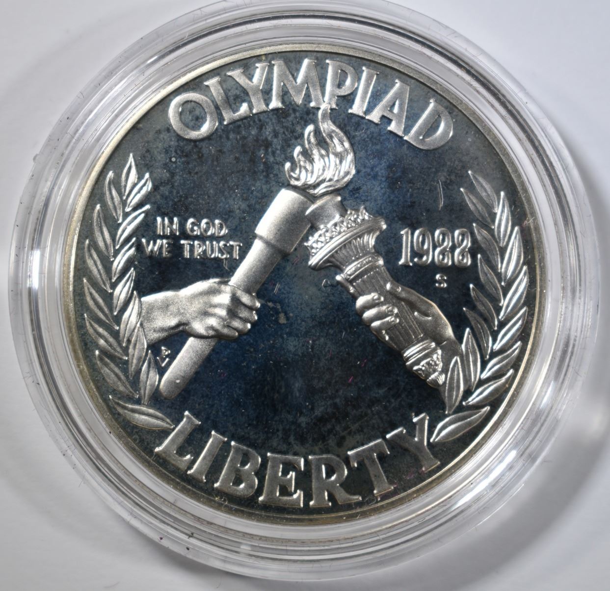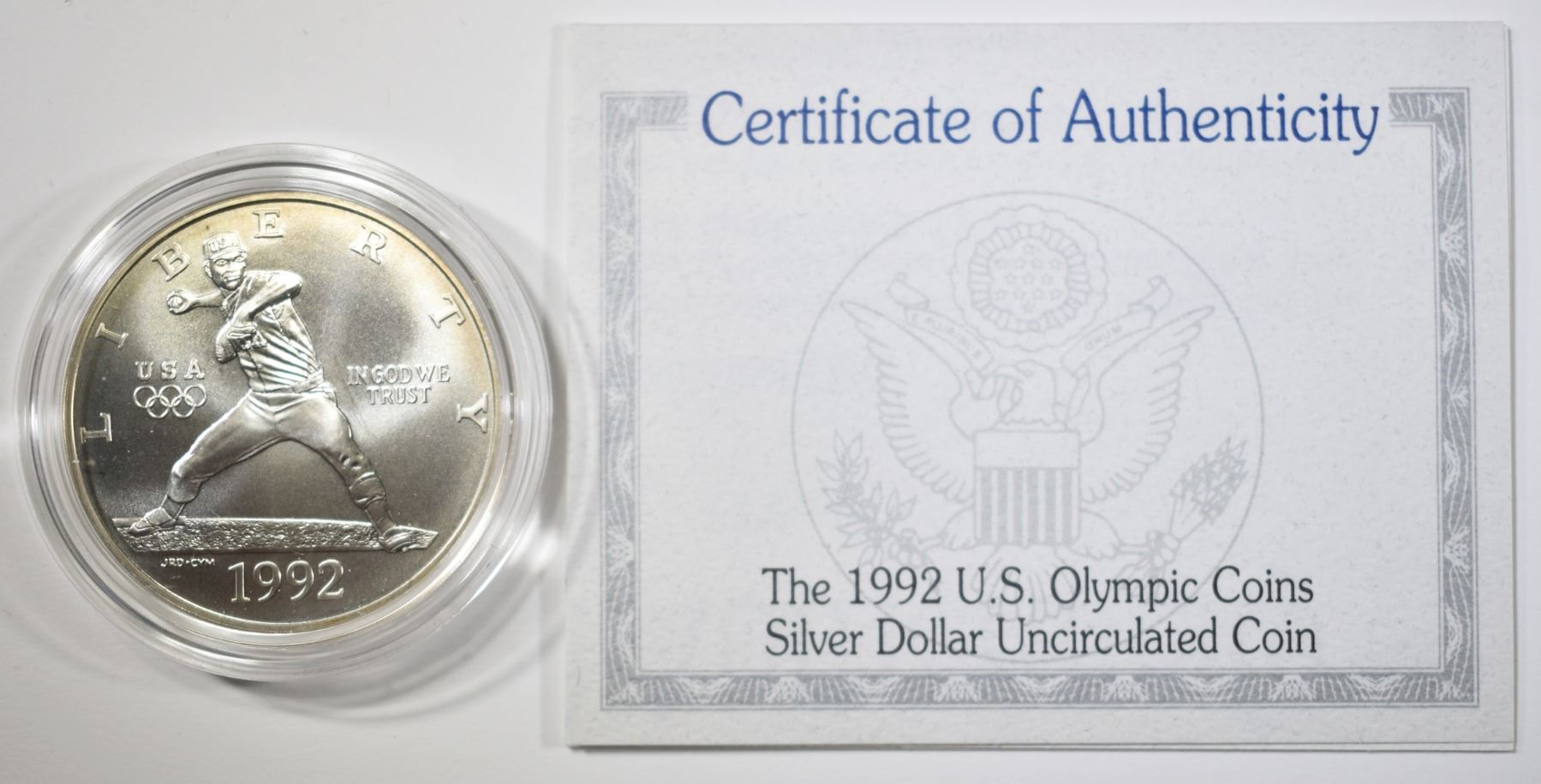 1988 OLYMPIC PROOF SILVER DOLLAR, 1992  OLYMPIC UNC SILVER DOLLAR & 1994 WORLD CUP  2-COIN PROOF SET.   ESTIMATE $85 - $100.