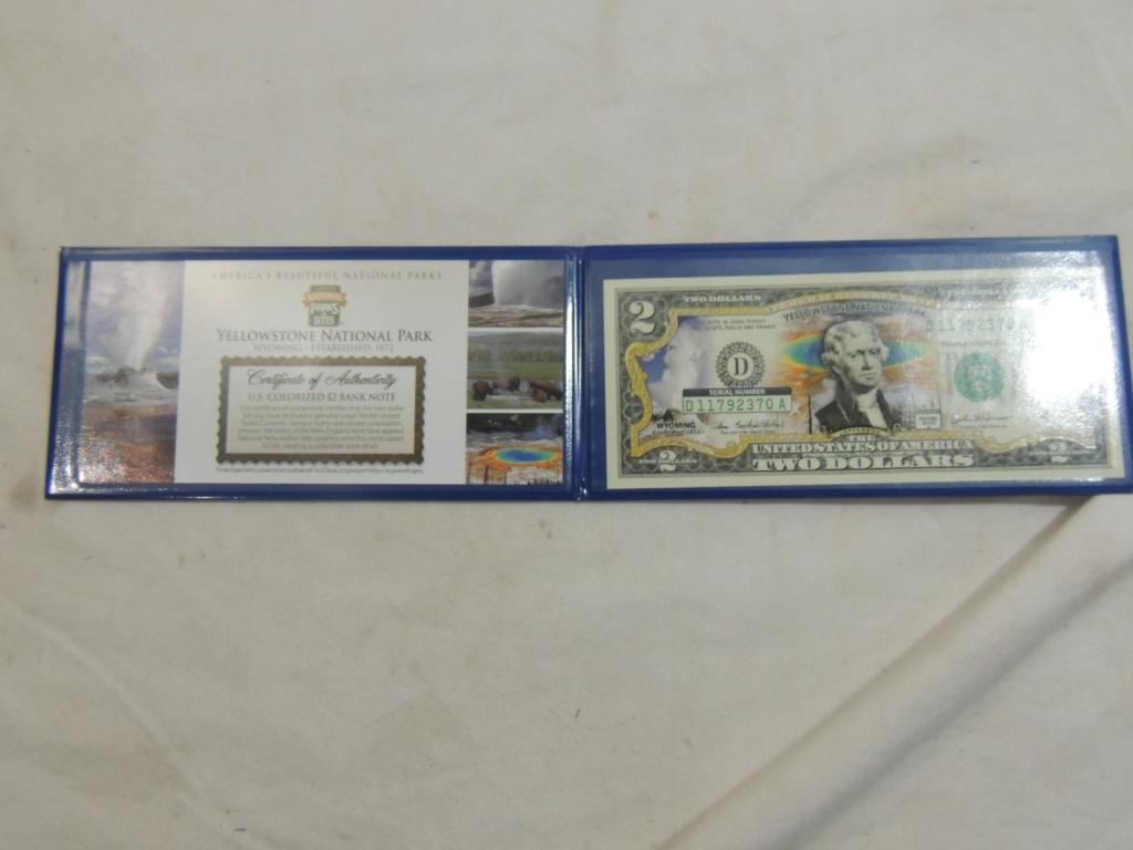US COLORIZED $2 BANK NOTE, YELLOWSTONE NATIONAL PARK WYOMING EST. 1872 COLLECTIBLE CURRENCY AS SHOWN SEE PHOTO FOR MORE DETAILS.