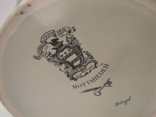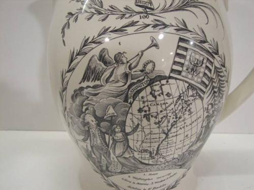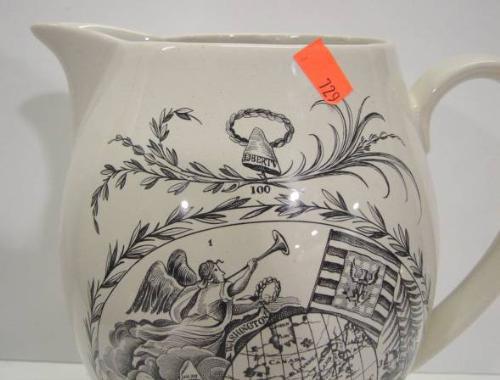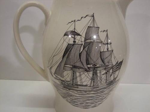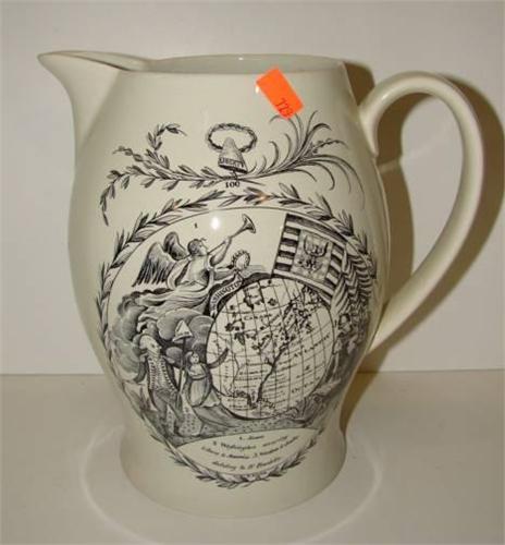 COMMEMORATIVE BICENTENNIAL PORCELAIN WATER PITCHER. Decorated with a ship on body as well as the U.S. crest and a tribute to George Washington. Marked at bottom "BICENTENNIAL APPROVED SEAL/MOTTAHEDEH/Portugal. 9" H